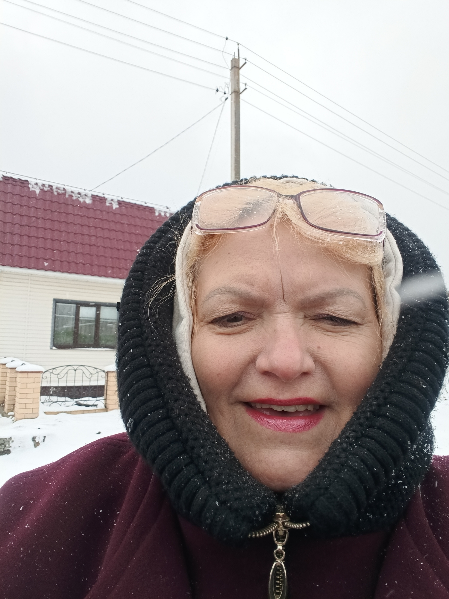 An older woman takes a selfie outdoors in what appears to be snowy weather in Красный Маяк, Russia. She is positioned close to the camera, filling most of the frame from the chest up. She has blonde h…read more