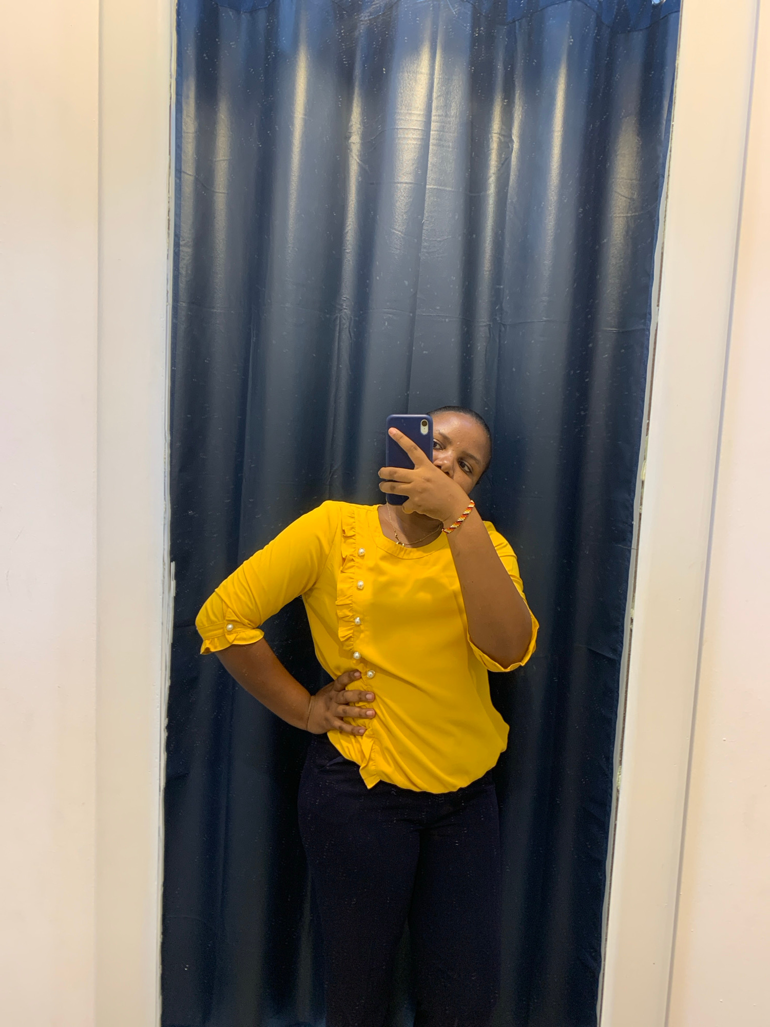 A person is taking a picture with a cell phone. The person is wearing a yellow shirt and dark blue pants. They are standing in front of a dark blue curtain. The location appears to be an interior spac…read more