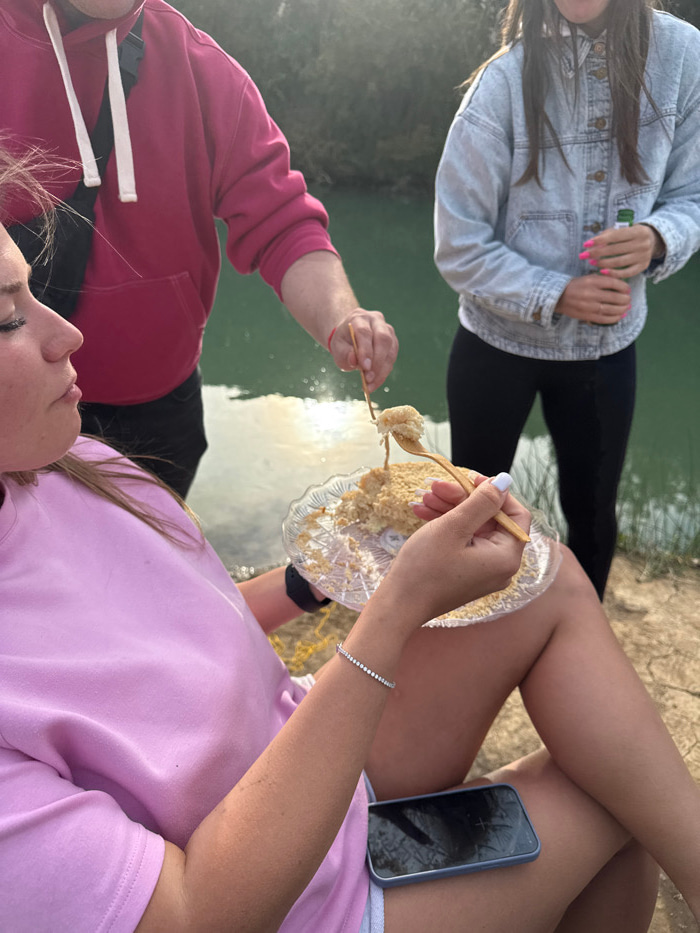 The image depicts three individuals outdoors in Prijevor, Montenegro, situated beside a body of water with sunlight reflecting on its surface. In the foreground, a female with light hair, wearing a li…read more