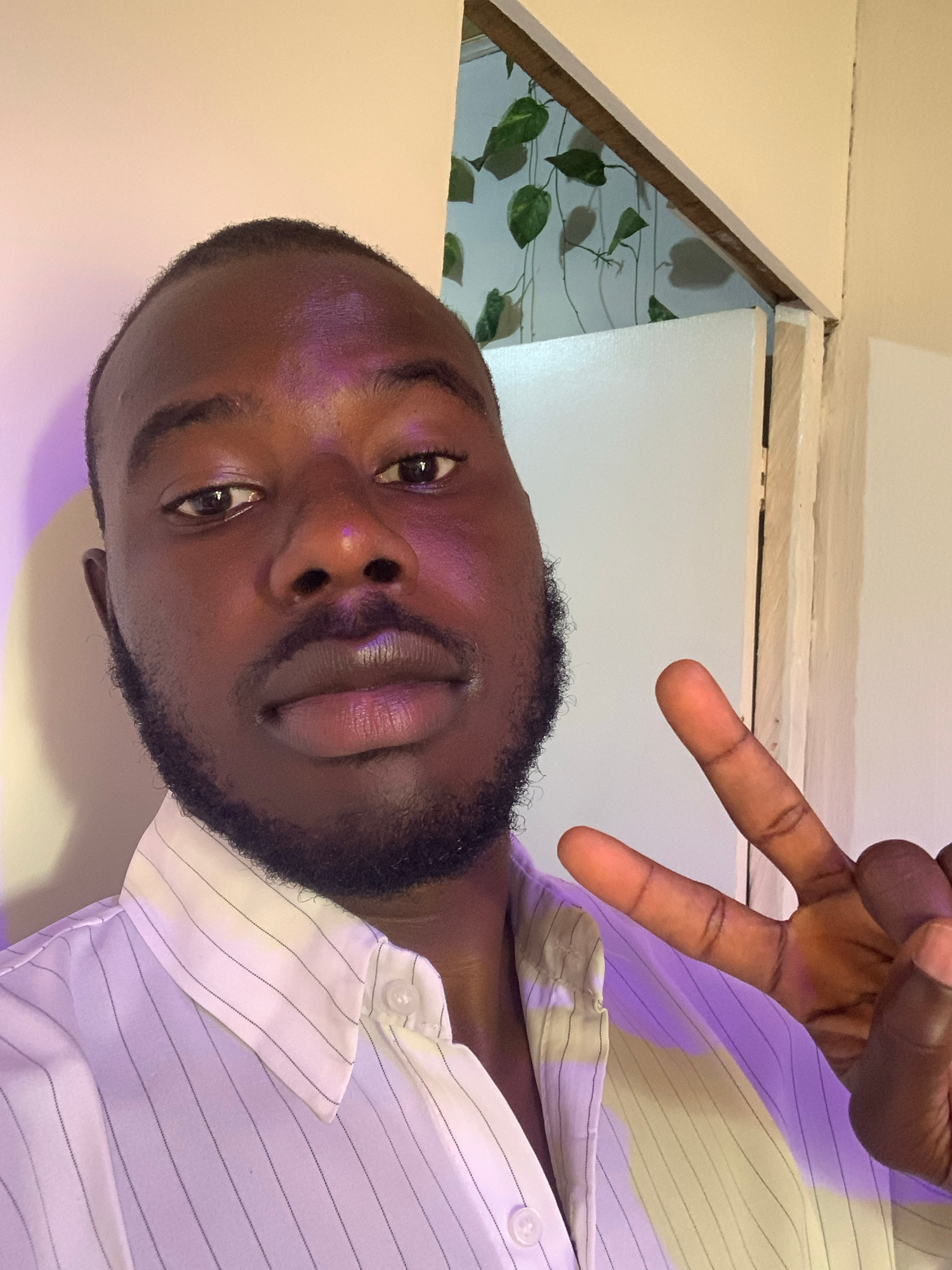 A dark-skinned man with a beard is posing for a selfie, making a peace sign with his right hand. He is wearing a light-colored, vertically striped collared shirt. The background shows a light-colored…read more