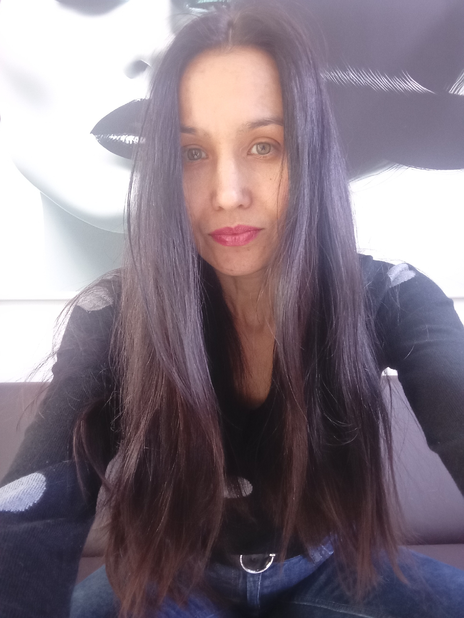 A woman is shown in a selfie-style, close-up portrait. She has long, dark hair, red lipstick, and is wearing a dark-colored shirt or sweater with light-colored polka dots on the sleeves. She appears t…read more