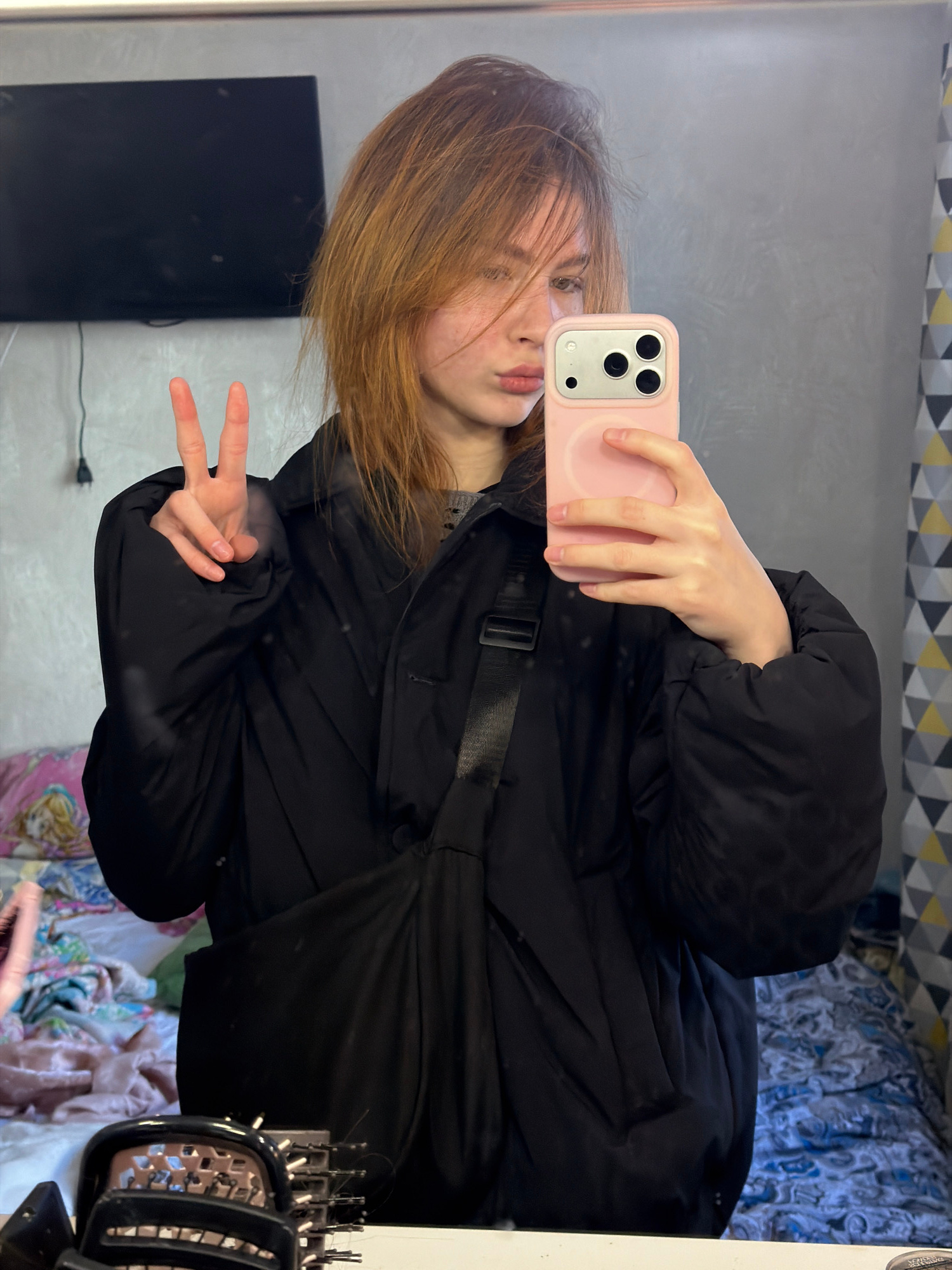 A young person with shoulder-length reddish-brown hair takes a selfie in a mirror using a pink-cased smartphone. They are wearing a black puffer jacket and making a peace sign with their left hand. Th…read more