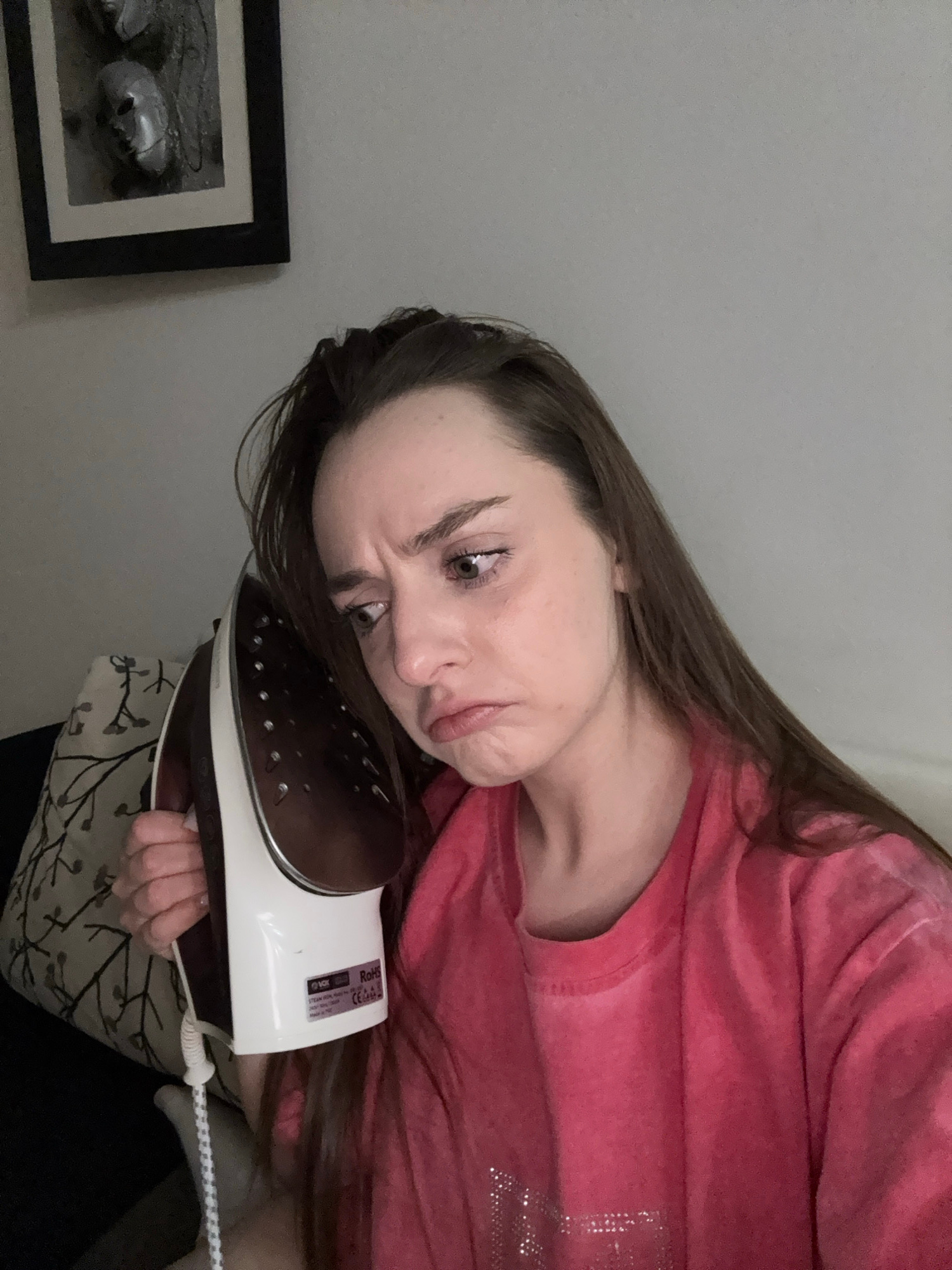 A woman is holding an iron to her face. She is wearing a pink shirt. The iron is white and brown. The background includes a gray wall with a framed picture. The location is not discernible from the image. | Open Wire