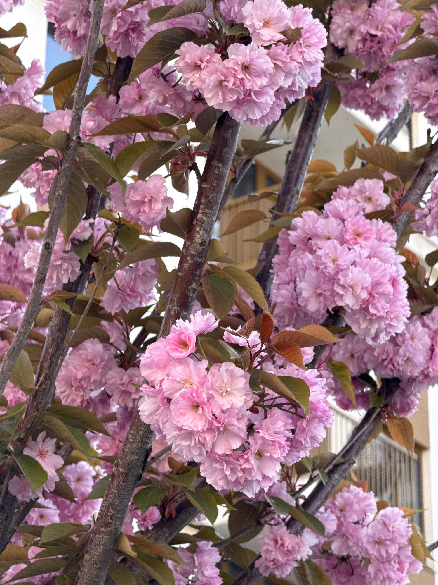 The image depicts a close-up view of blooming pink cherry blossoms. The blossoms are clustered together in dense bunches on the branches of a tree. The tree has leaves that are a mix of green and bron…read more