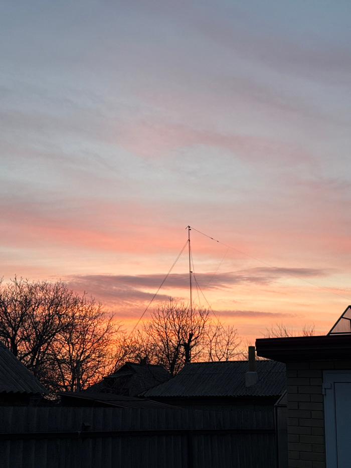 The image depicts an outdoor scene in Makiivka, Ukraine, at either sunrise or sunset. The sky dominates the upper two-thirds of the frame, transitioning from a light blue-grey at the zenith to vibrant…read more