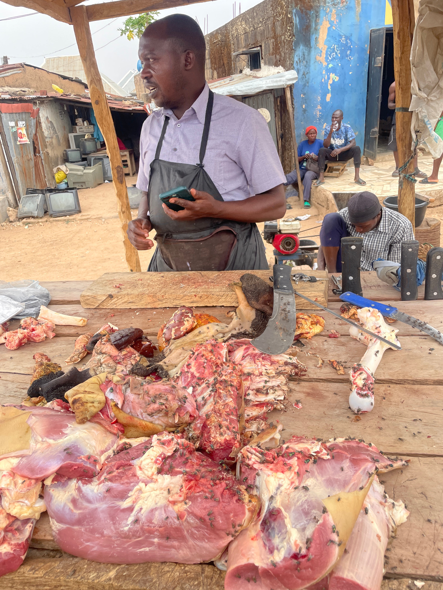 The image captures a butcher shop scene in Jos, Nigeria. A man wearing a light purple shirt and black apron is visible, holding a smartphone in his left hand. Adjacent to him is a wooden table coveredβ¦read more