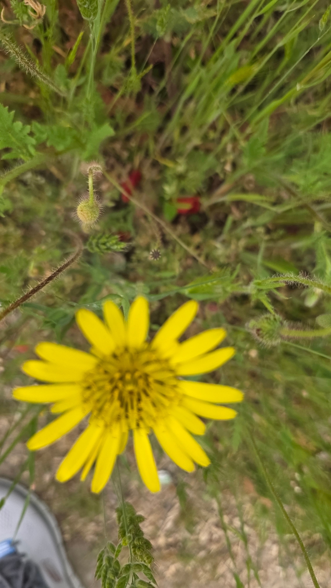 The image shows a yellow flower with numerous petals and a dark center, surrounded by green grass and foliage. There are also some poppy seed pods present. The presence of poppy seed pods suggests a f…read more