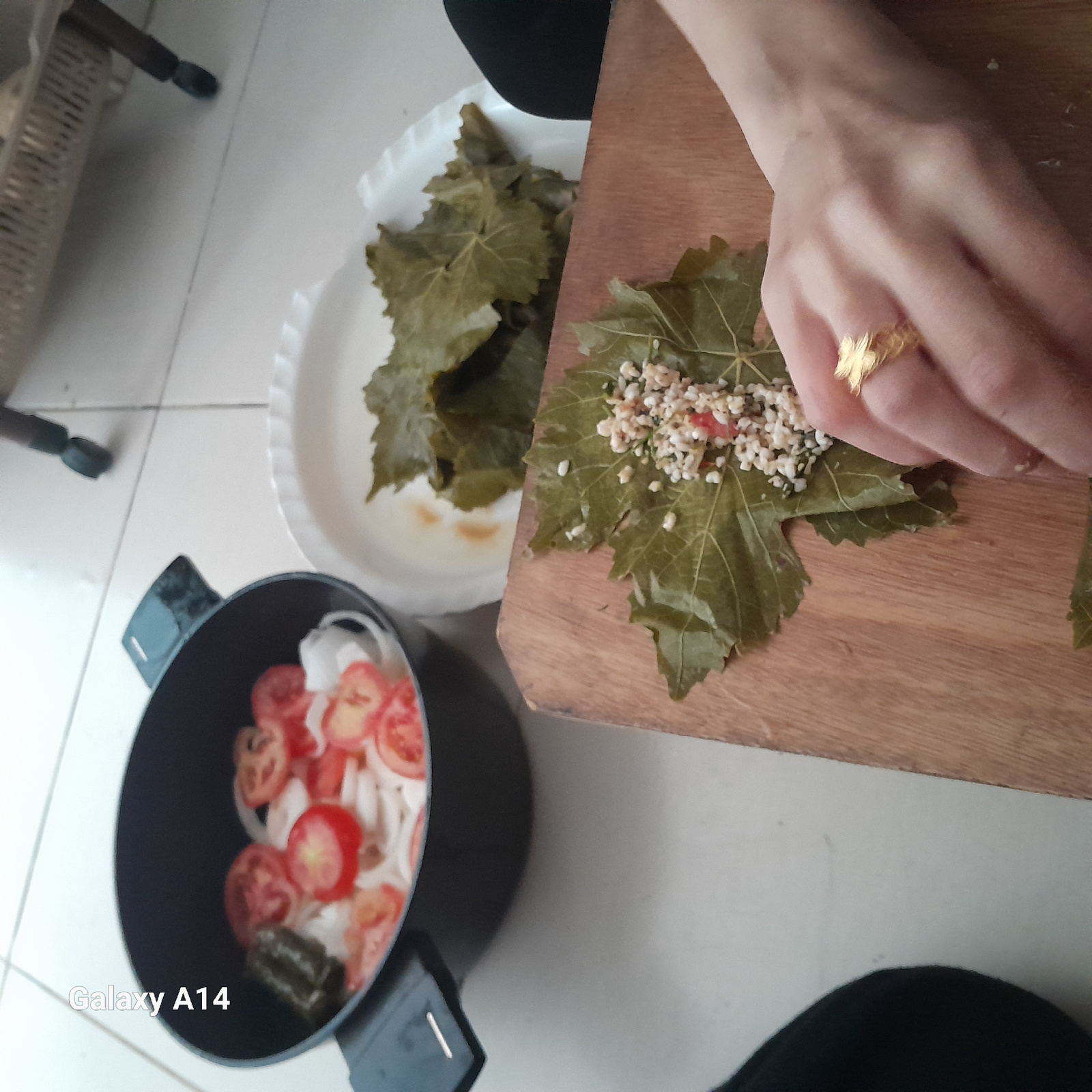 The image shows the preparation of stuffed grape leaves, a Middle Eastern and Mediterranean dish. A person, wearing a gold ring, is preparing the leaves on a wooden board, placing a rice-based filling…read more