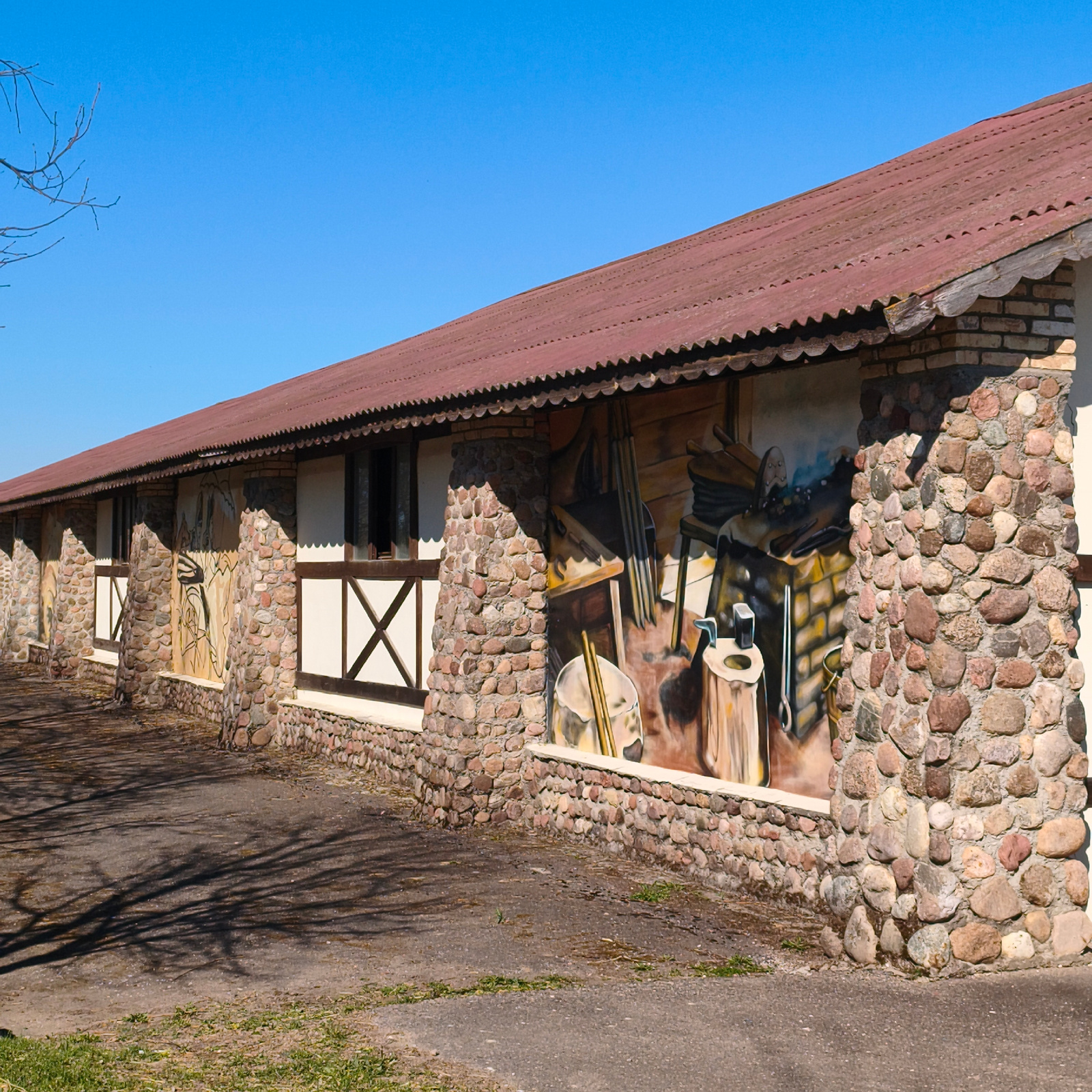 The image captures the side of a low, elongated building in Капцёўскі сельскі Савет, Belarus. The building has a distinctive architectural style, featuring alternating sections of whitewashed walls wi…read more
