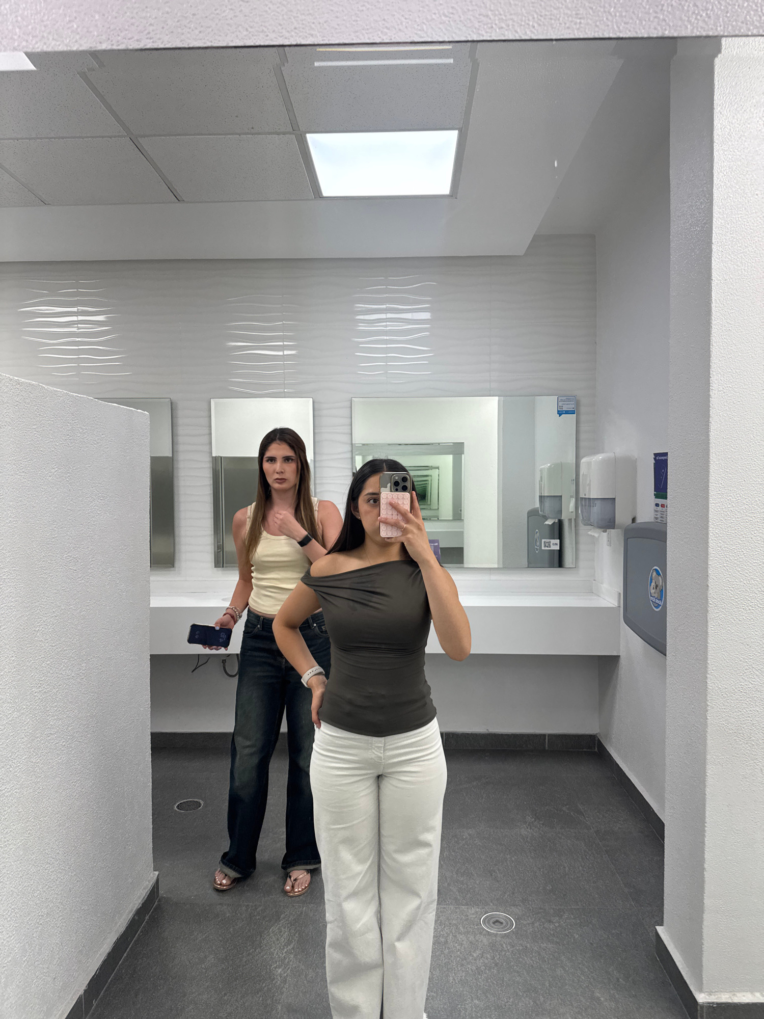 This media file captures a mirror selfie of two young women in a modern, well-lit public restroom. The image, originally rotated 90 degrees clockwise, shows the women standing in front of a counter wi…read more