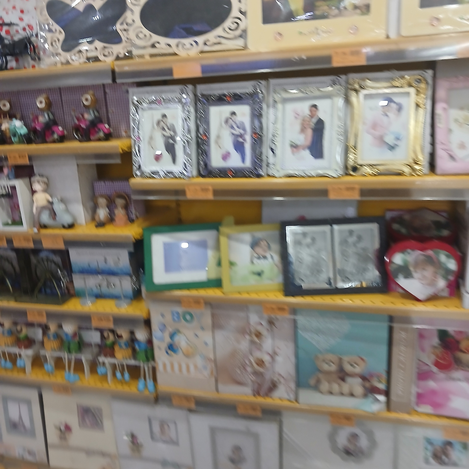 The image depicts a display of photo frames and decorative items, likely within a retail store in Gaza, Palestinian Territory. The frames vary in style, size, and color, some containing images of peop…read more