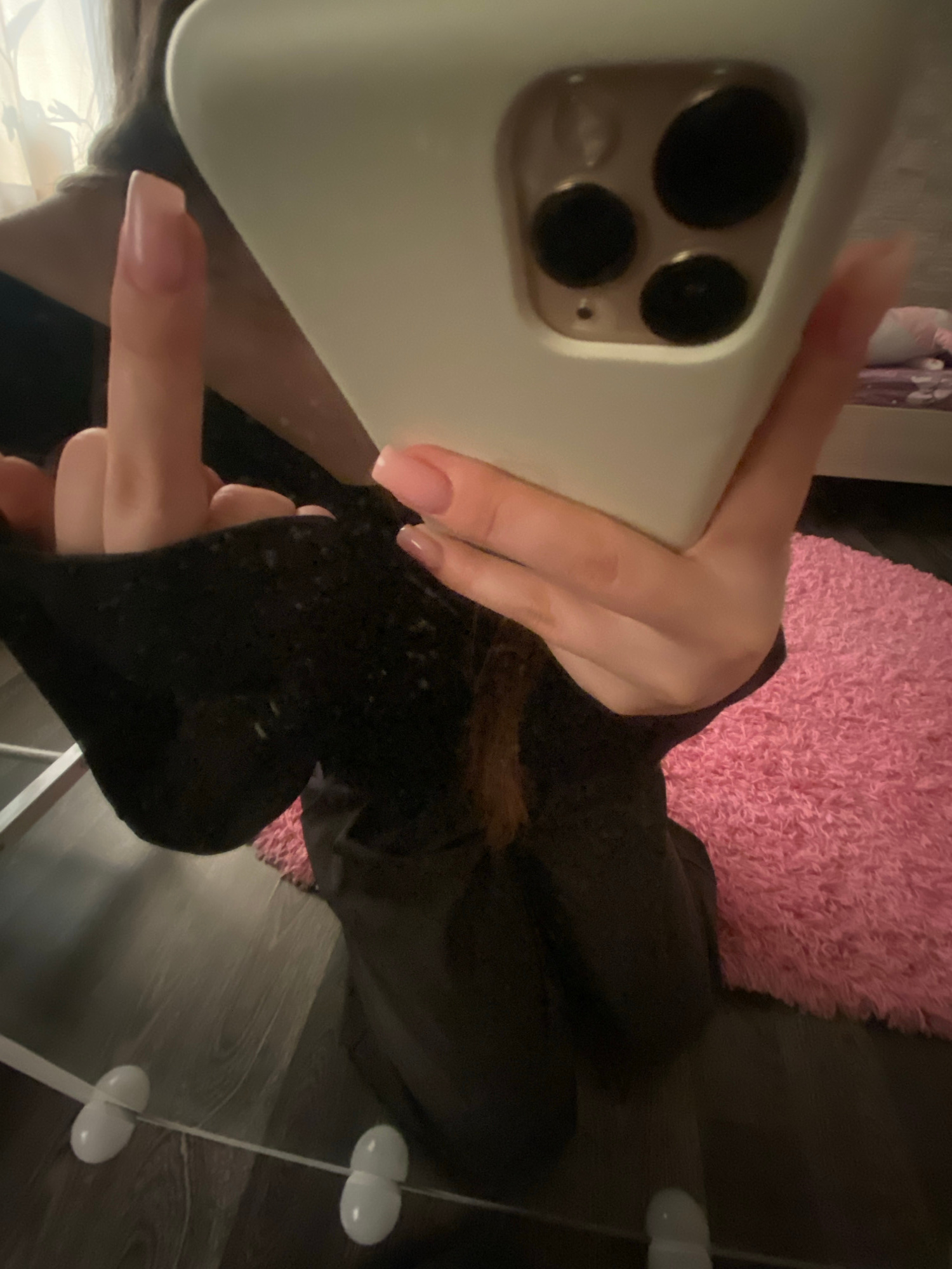 The image captures a close-up, angled view of a person's hand holding a smartphone, likely taken as a mirror selfie or a photo of an outfit. The primary subject is a hand with manicured nails, painted…read more