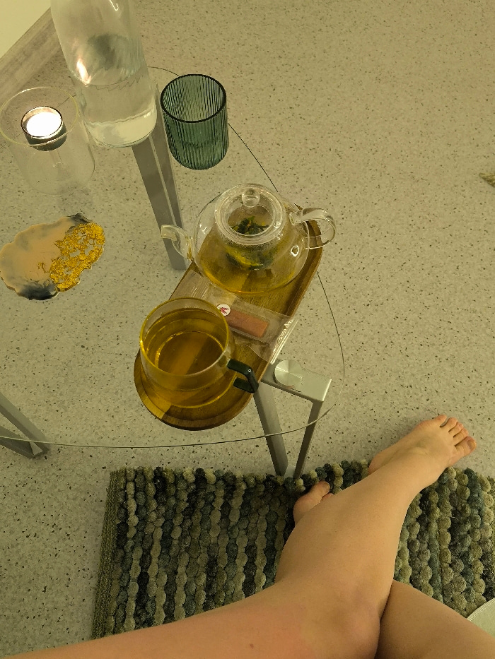 An overhead view reveals an indoor scene in Vinnytsia, Ukraine, featuring a clear glass triangular table with metal legs positioned on a light-colored, speckled floor. On the table, from left to right…read more