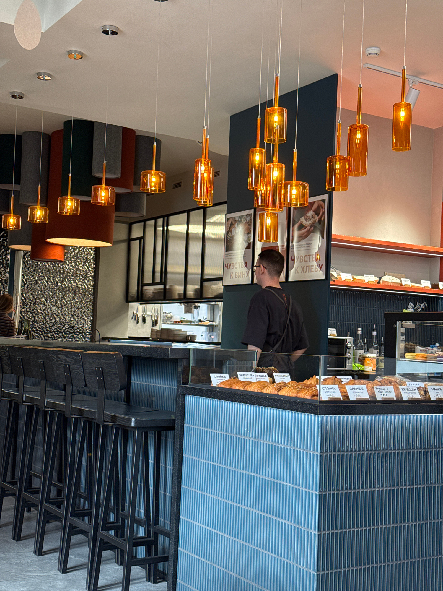 A vertically oriented photograph captures the interior of a shop or bakery in Krasnoyarsk, Russia. A male shop assistant stands behind a glass display case filled with pastries and price tags writtenβ¦read more