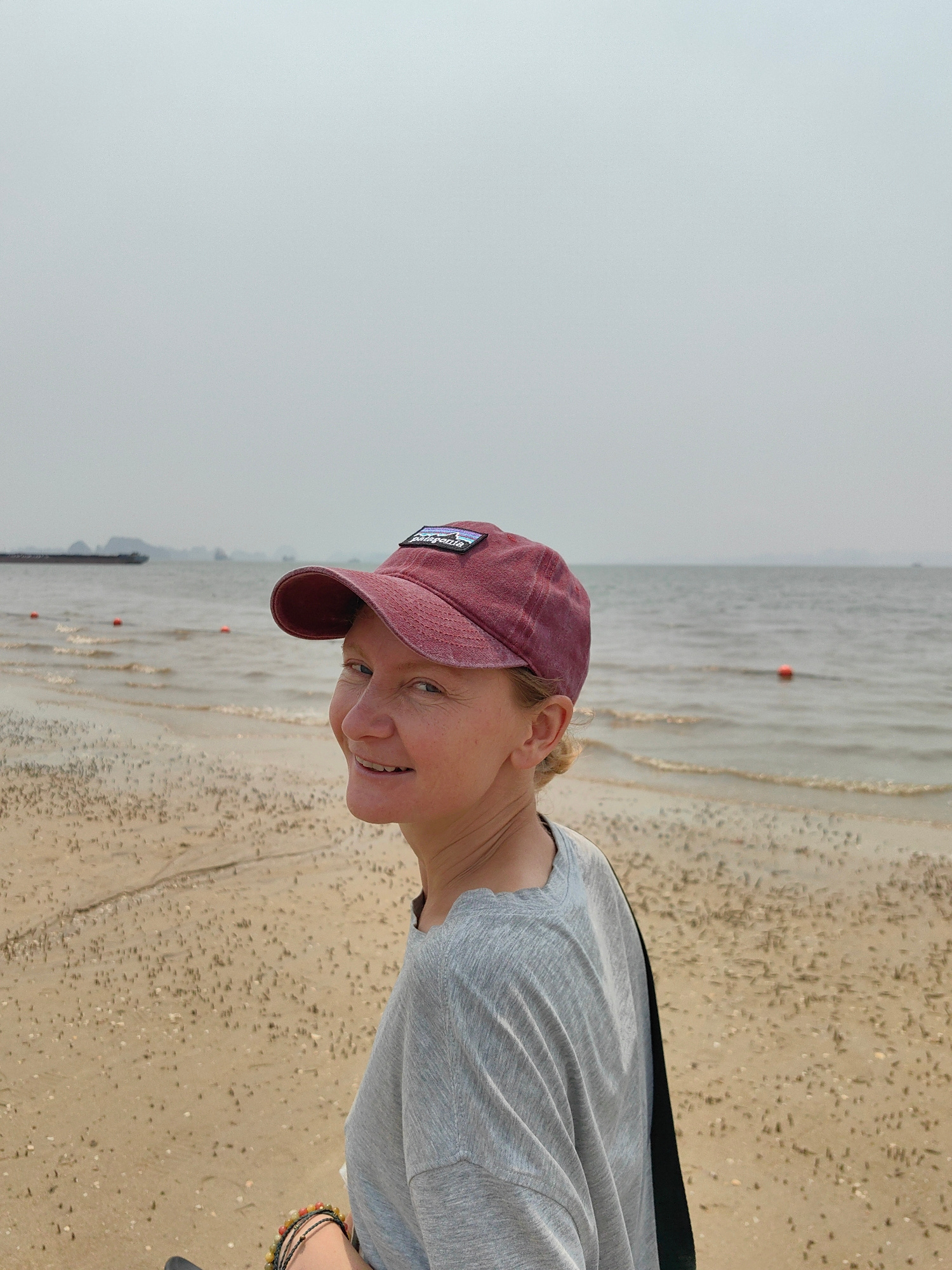 A woman stands on a beach in Bai Chay Ward, Vietnam. She is wearing a red baseball cap and a gray t-shirt. The beach is sandy with small objects scattered on the surface. The water is calm with a few…read more