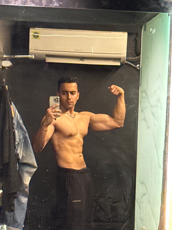 A shirtless man flexes in a bathroom mirror, holding a phone in his left hand to capture the moment. He's wearing dark athletic shorts. The background includes a grey industrial-style electrical box m…read more