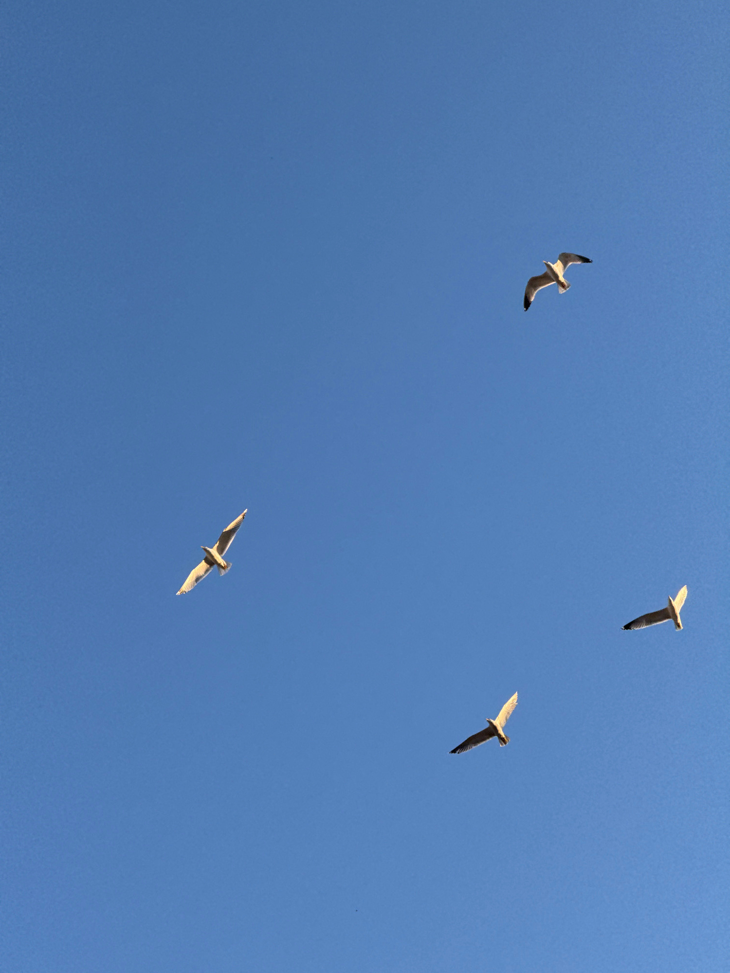 The image displays a clear, vibrant blue sky, serving as the sole backdrop for four gulls in flight. The sky is uniformly colored, indicating fair weather with no visible clouds. The four gulls are s…read more