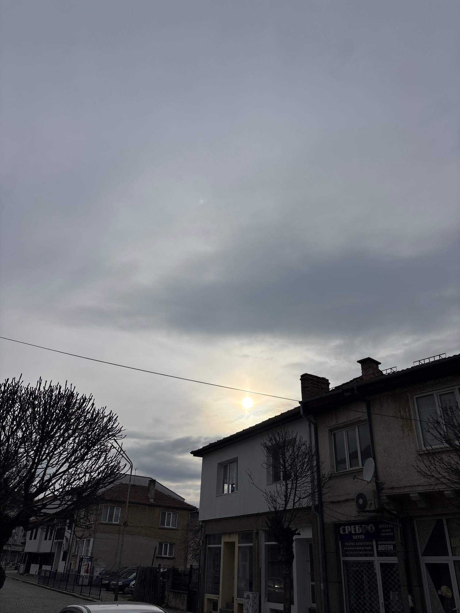 The image shows a cloudy sky above buildings in Tryavna, Bulgaria. The sun is partially obscured by clouds, positioned between the buildings. A bare tree is in the foreground. The buildings are of var…read more