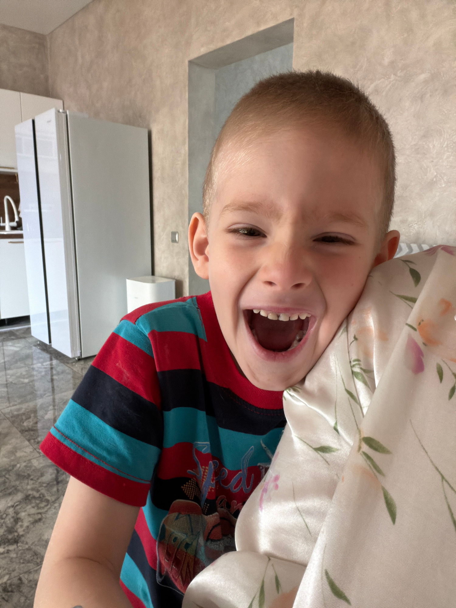 A young boy with short blond hair is laughing widely with his mouth open, displaying his teeth. He is wearing a striped long-sleeved shirt with alternating red, blue, and black stripes, and part of a…read more