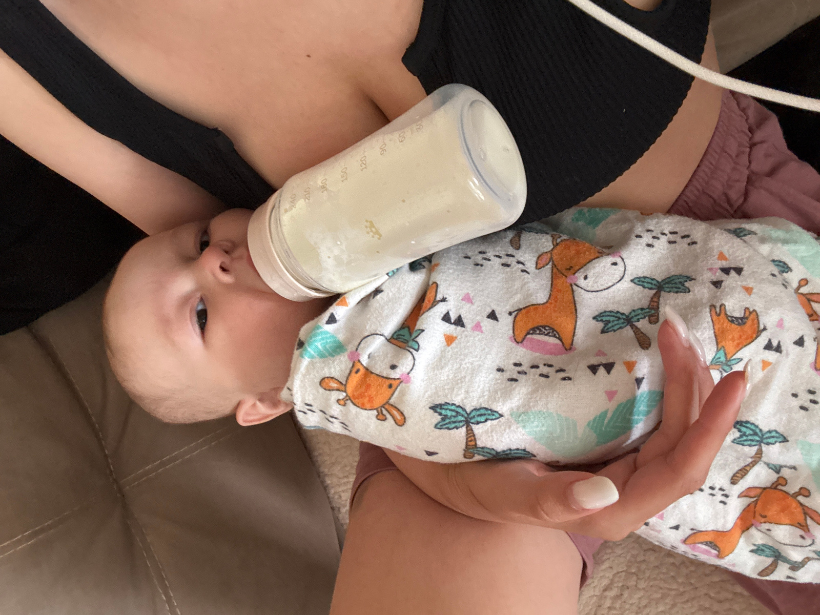 A baby is lying on a patterned blanket, being fed from a bottle held by an adult. The baby is looking at the camera with one eye visible. The adult is wearing a black top and pink shorts, and their ha…read more