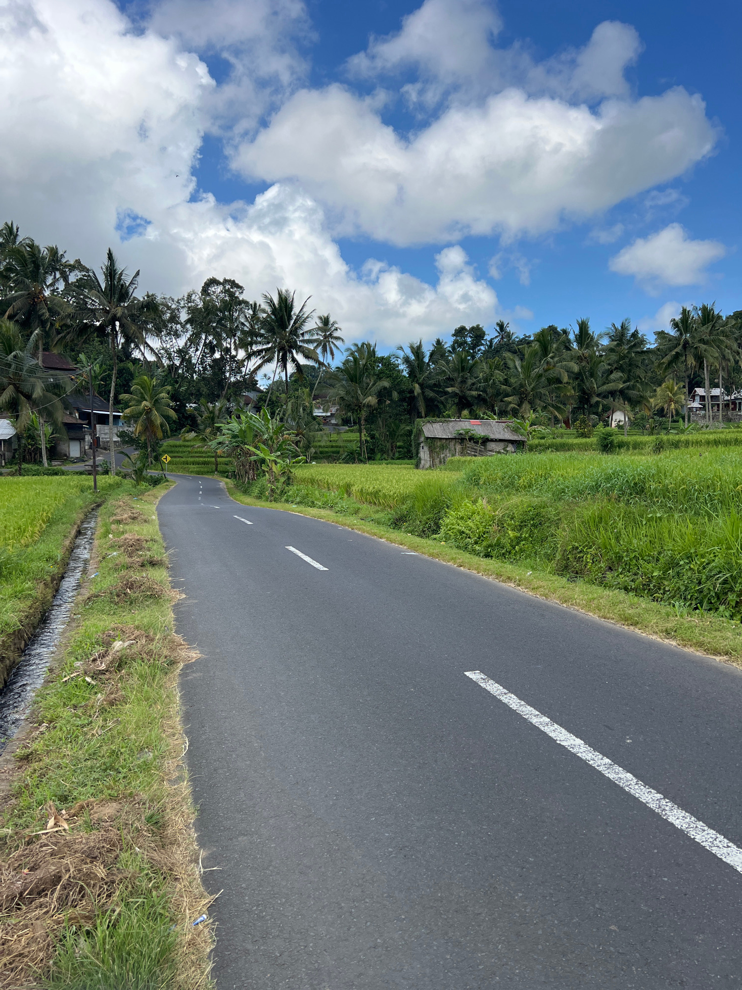 The image shows a road in Bebandem, Indonesia. The road is asphalt with a white stripe down the center. On either side of the road is green grass. The left side of the road is lined with rice paddiesβ¦read more