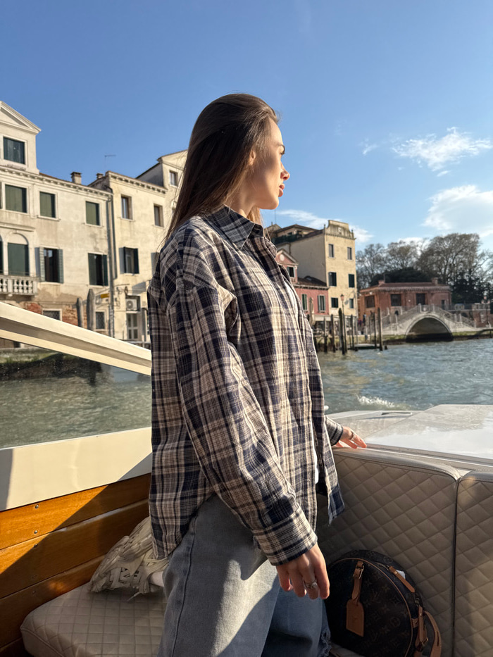 A young adult female is depicted standing in profile, facing right, on a boat in a Venetian canal. She wears a brown, beige, and dark blue plaid long-sleeved shirt over a white undershirt and light bl…read more