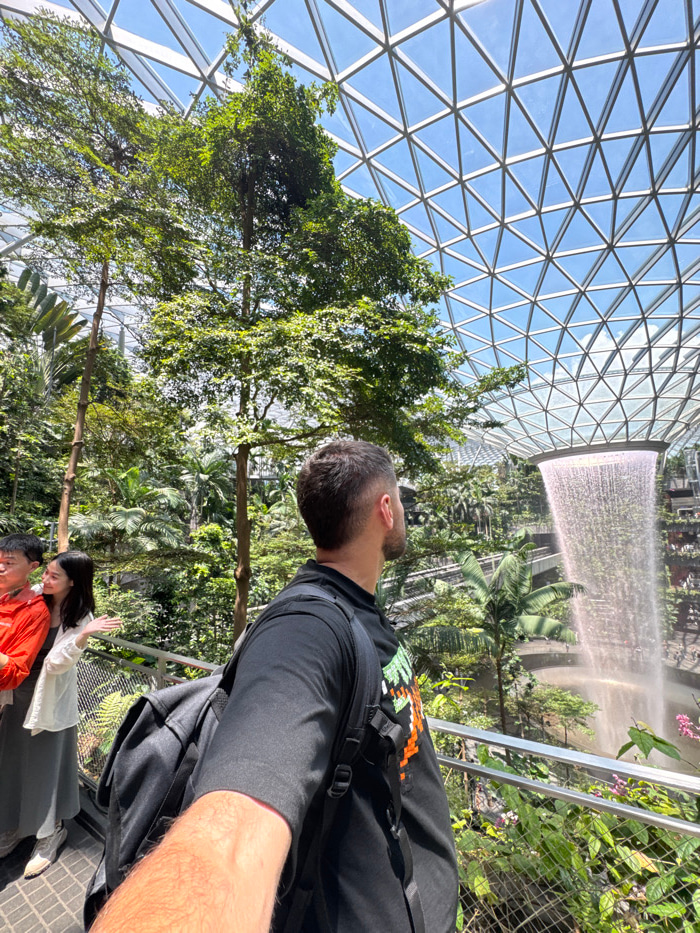 A man is captured taking a selfie on an elevated walkway within the Shiseido Forest Valley at Jewel Changi Airport, Singapore. He is seen from a rear-right perspective, wearing a black t-shirt with a…read more