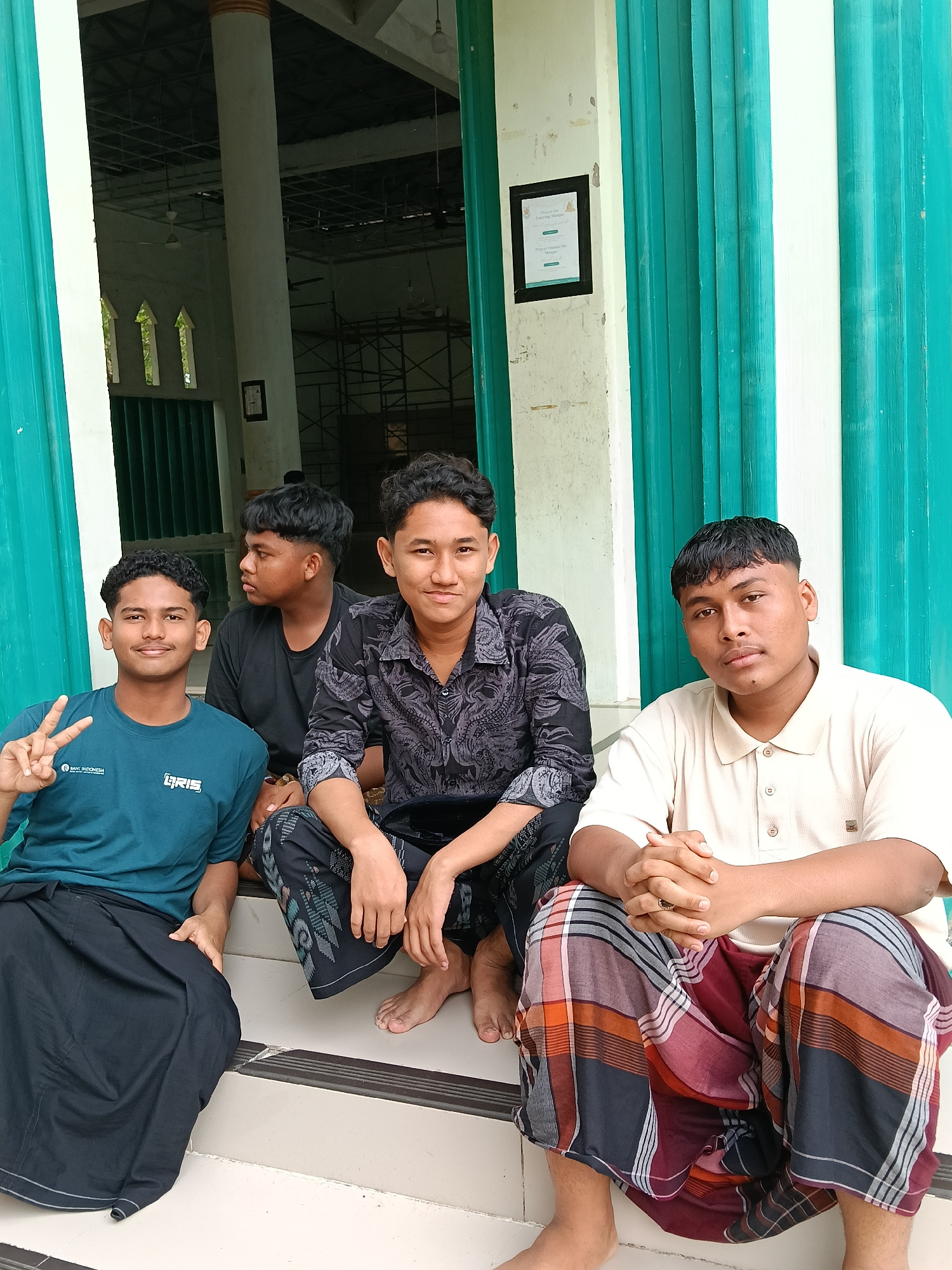 Four young Indonesian men are casually seated on the steps of what appears to be a mosque, likely in Lhokseumawe, Indonesia. The building's exterior features prominent white and teal vertical striped…read more