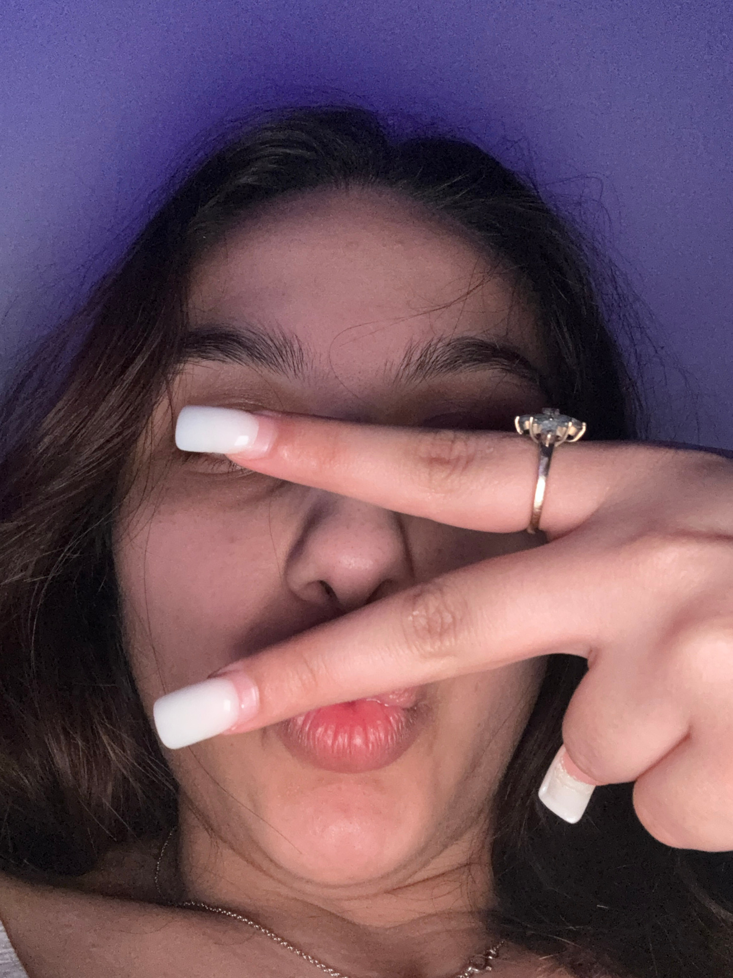 A close-up, angled shot depicts a young person's face obscured partially by a hand displaying long, square-shaped, white acrylic nails. A ring adorns the ring finger, featuring a light-colored gemston…read more