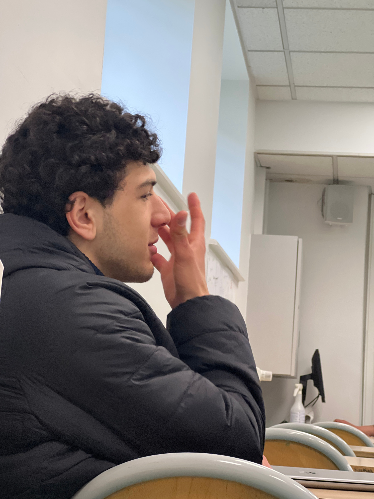 A person with dark curly hair is seated in a room with white walls and office-style furniture. They are wearing a black puffy jacket. Their hand is raised near their face. The location appears to be a…read more