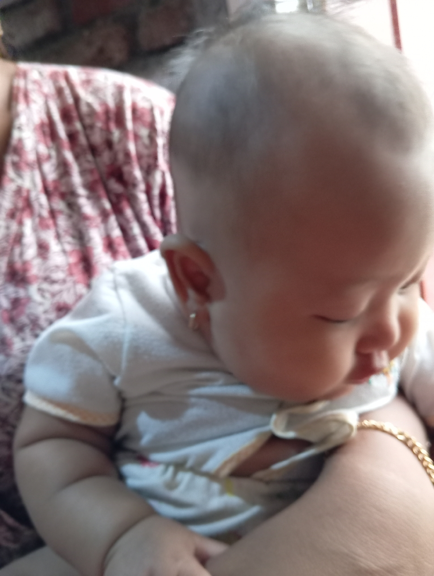 A baby lies sleeping in someone's arms. The baby is wearing a white shirt. The person holding the baby is wearing a floral print garment. A gold bracelet is visible on the person's arm. The location i…read more