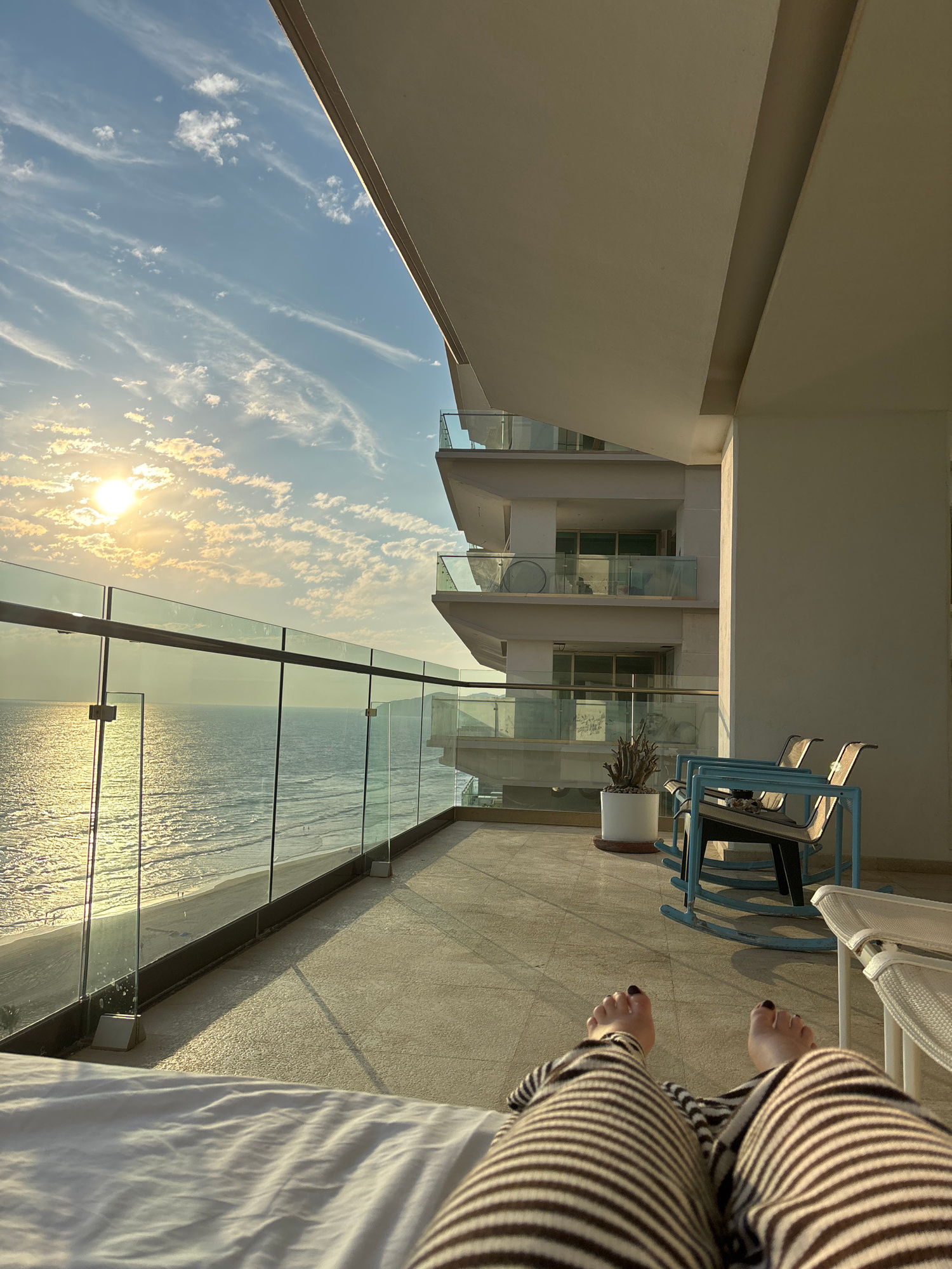 The image shows a balcony view, likely taken from a hotel room in Acapulco, Mexico. The perspective is tilted, displaying the sky with the sun low on the horizon, reflecting light onto the ocean. The…read more