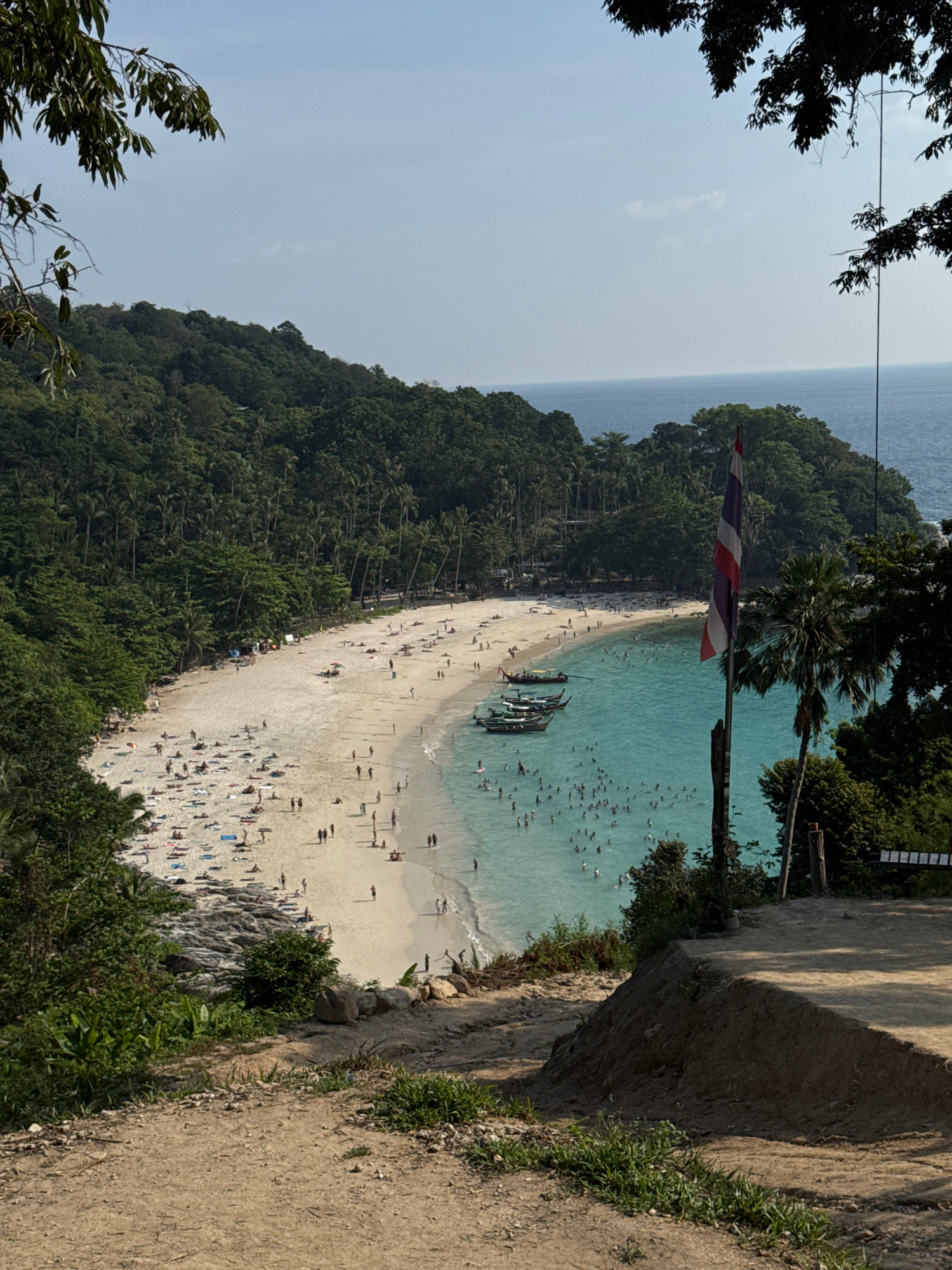 The image depicts a crowded beach in Patong, Thailand, from an elevated perspective. The beach is sandy with numerous people sunbathing, walking along the shore, and swimming in the turquoise water. S…read more