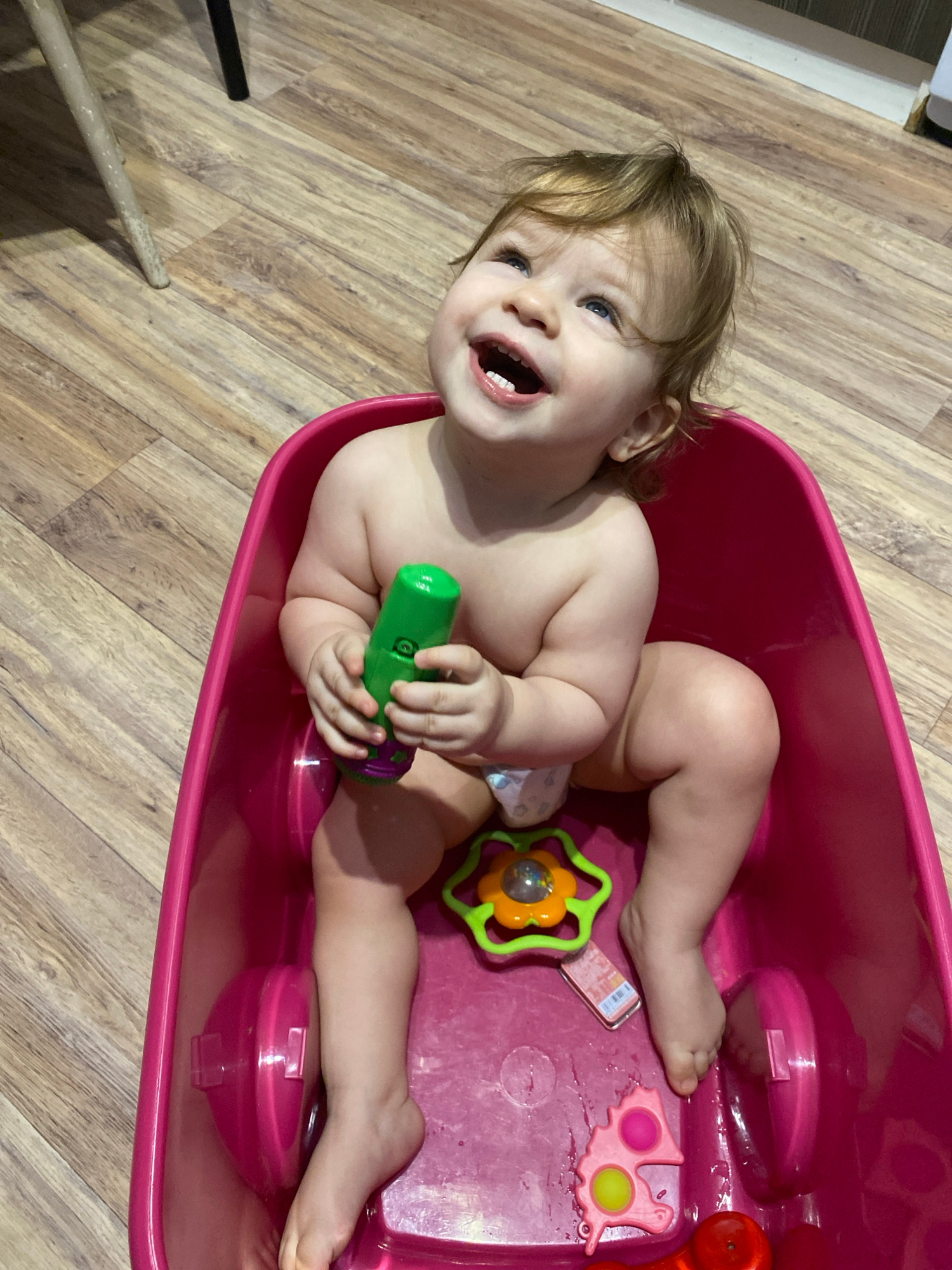 A toddler sits in a pink bathtub filled with water and toys on a wood floor. The child is smiling and holding a green and purple toy. The bathtub also contains a green flower-shaped toy, a pink butter…read more