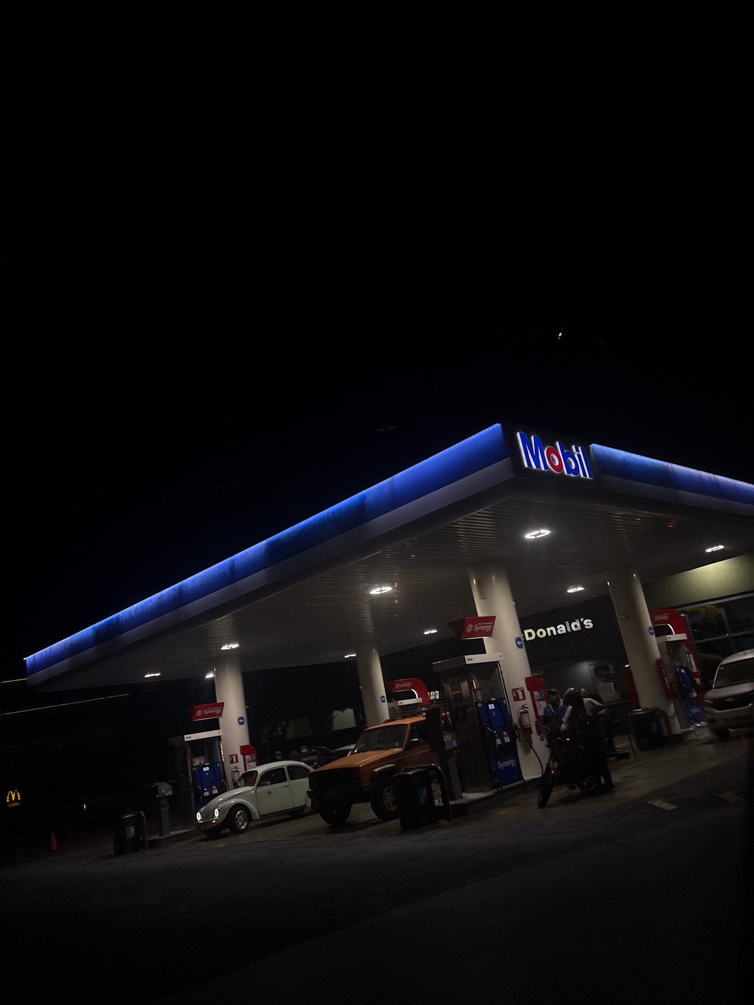 The image shows a Mobil gas station with a McDonald's in San Andrés Cholula, Mexico at night. Several cars are parked at the gas pumps. The Mobil sign is illuminated with blue lighting.