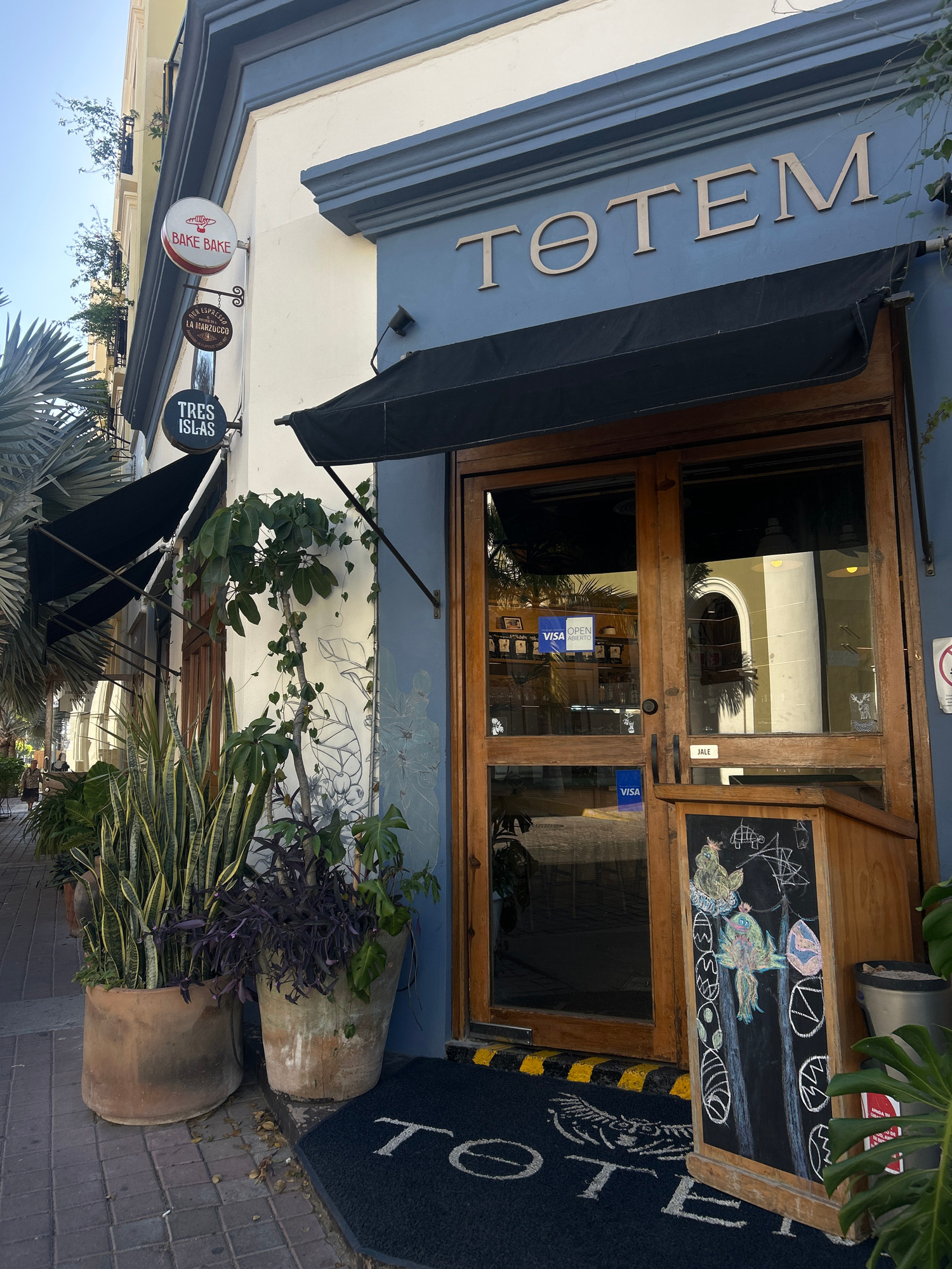 The image captures the vibrant entrance of a storefront named "TOTEM" on a paved sidewalk, likely in Mazatlán, Mexico. The building features a dark blue upper facade with large, golden, serif letters…read more