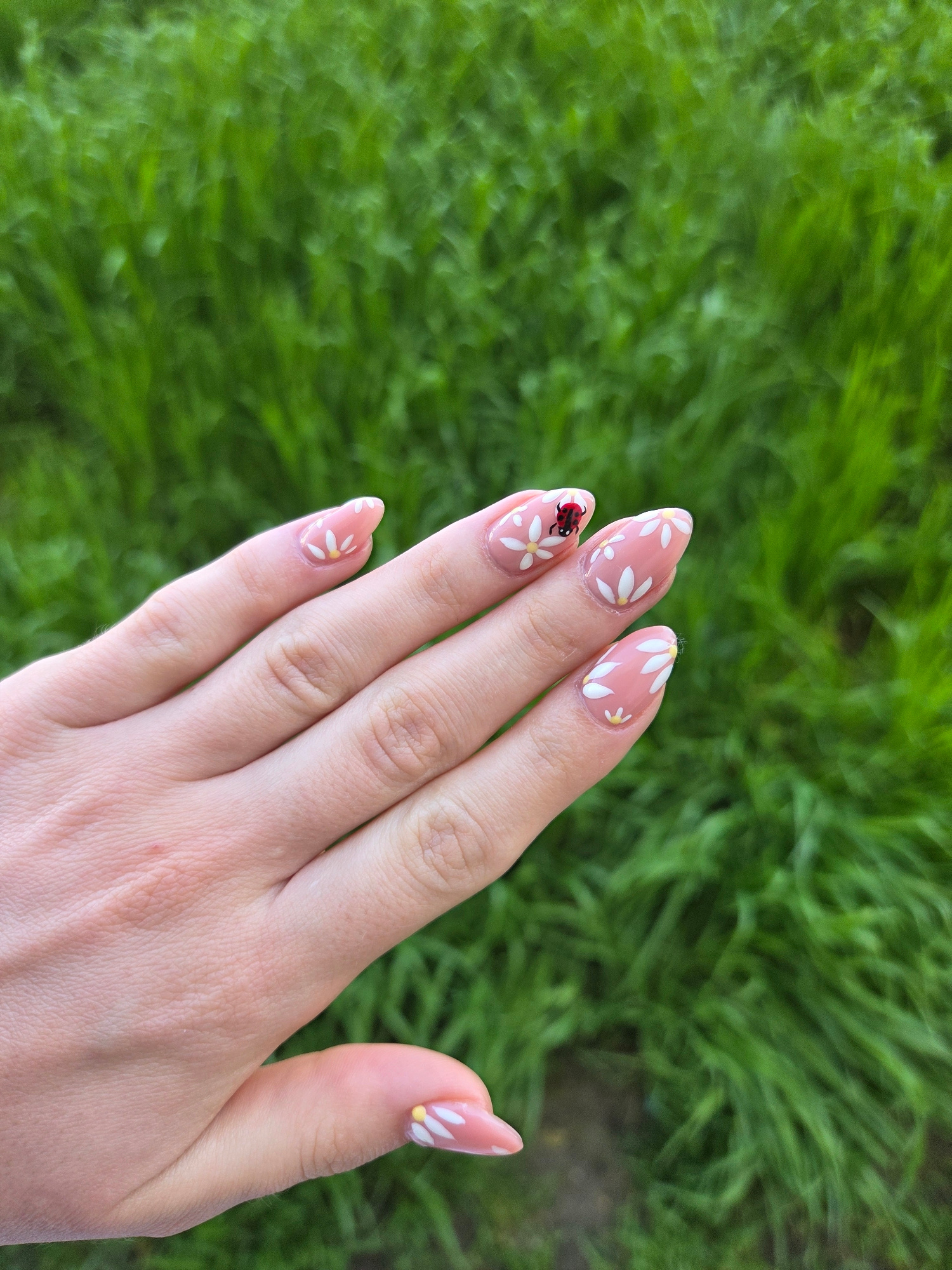The image captures a person's left hand held against a blurred background of vibrant green grass. The hand is angled, showcasing a set of almond-shaped nails adorned with intricate nail art. The nail…read more