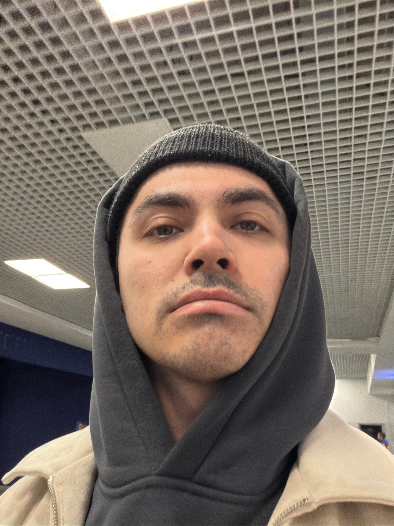 A close-up photograph shows a person wearing a gray hooded sweatshirt and a gray knit hat under the hood. A beige jacket is partially visible over the sweatshirt. The person's face is turned slightly,…read more