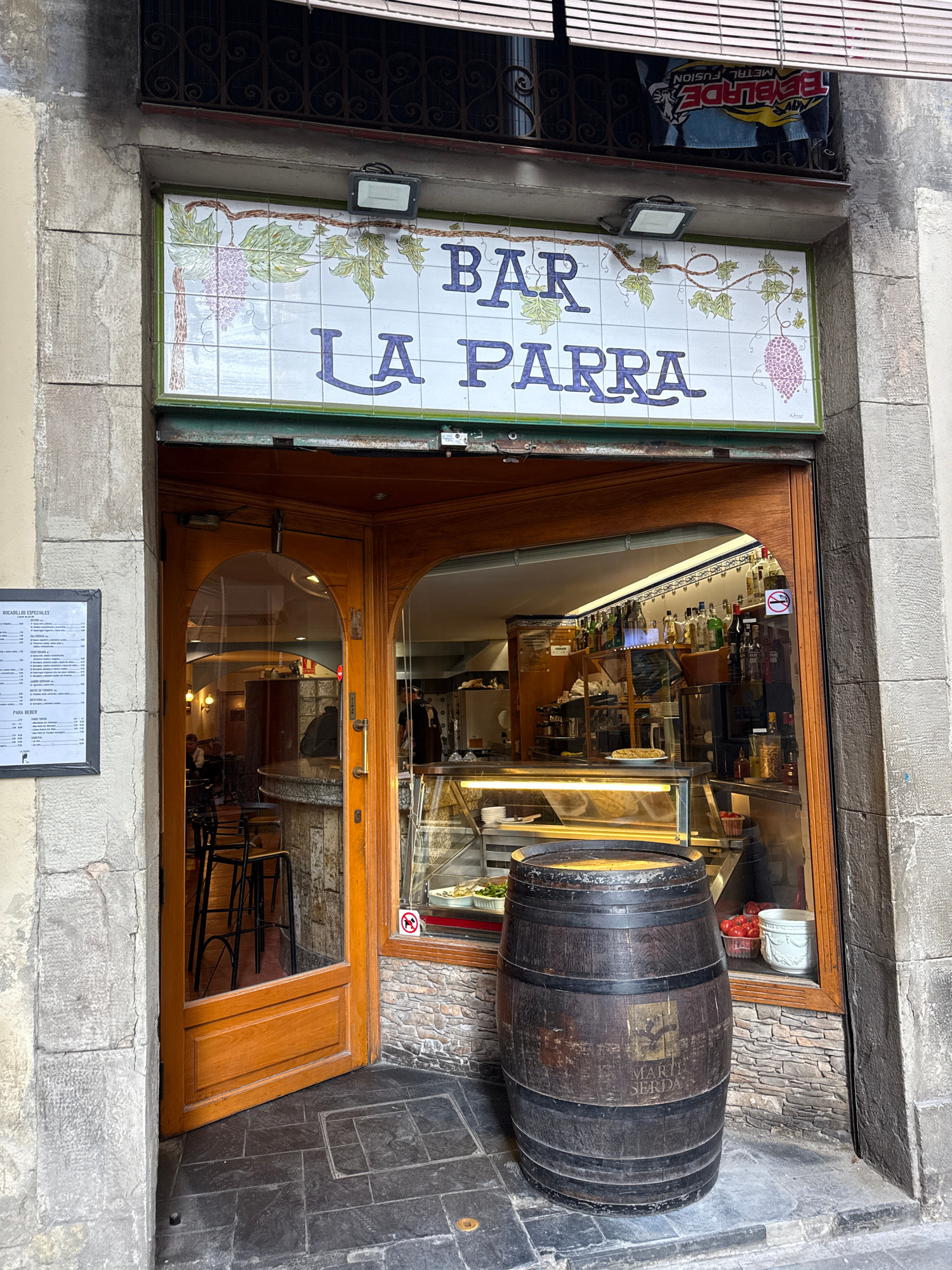 The image shows the entrance of "Bar La Parra", located in Barcelona, Spain. The bar's name is displayed vertically on a tiled sign featuring a grape vine design. The entrance has a wooden door with a…read more