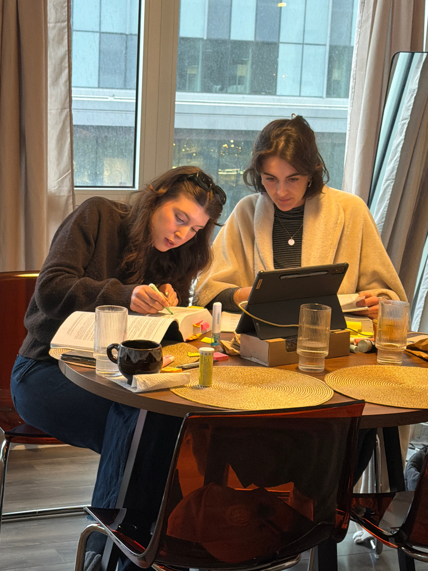 Two women are seated at a small round table indoors, near a large window offering a cityscape view, possibly in Montreal, Canada due to the building architecture. One woman wears a beige robe and a st…read more