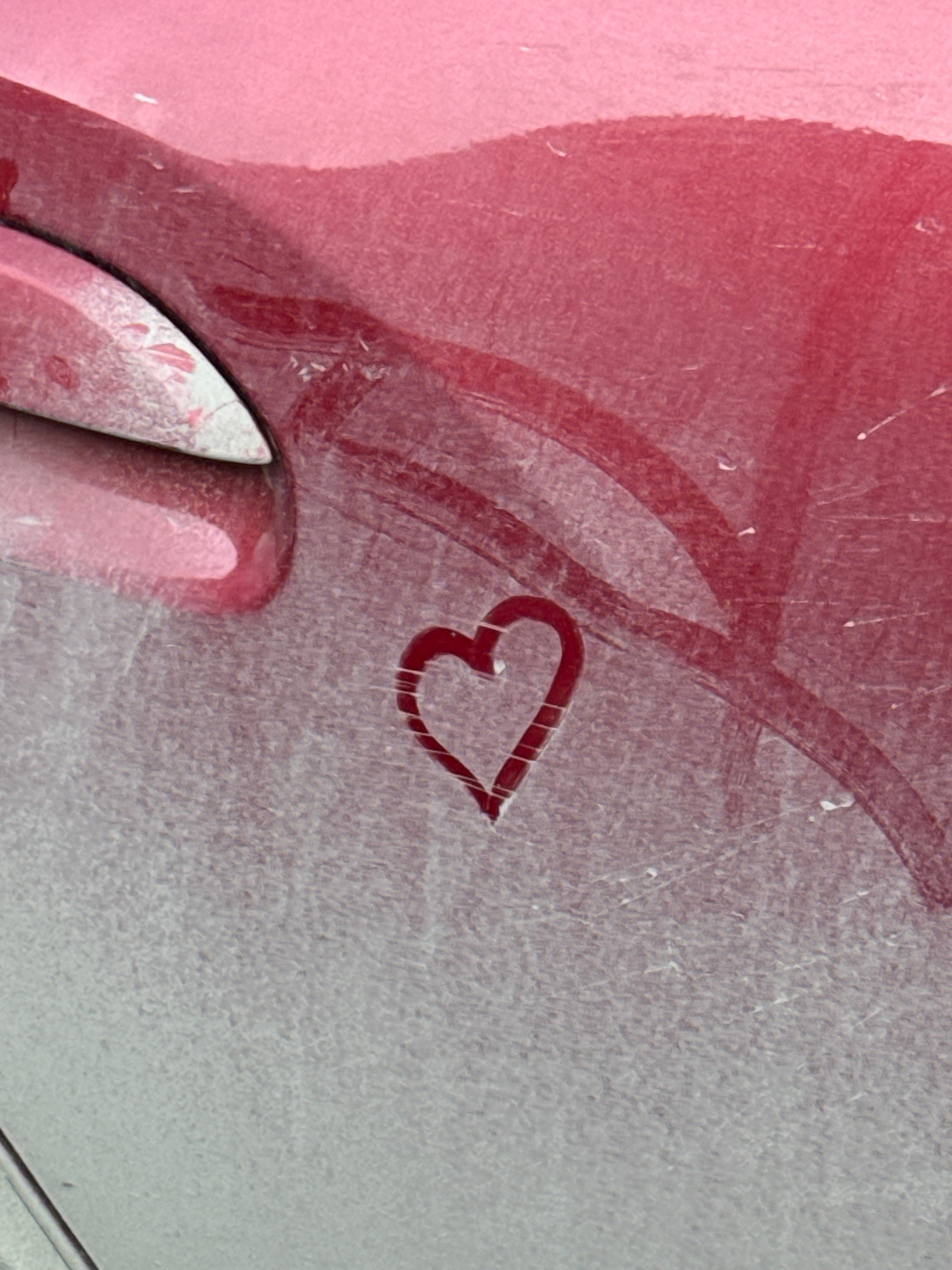 The image shows a close-up of a surface, likely a car, covered in dust. There is a red heart shape drawn in the dust, as well as other red markings or streaks. The background is a mix of light gray an…read more