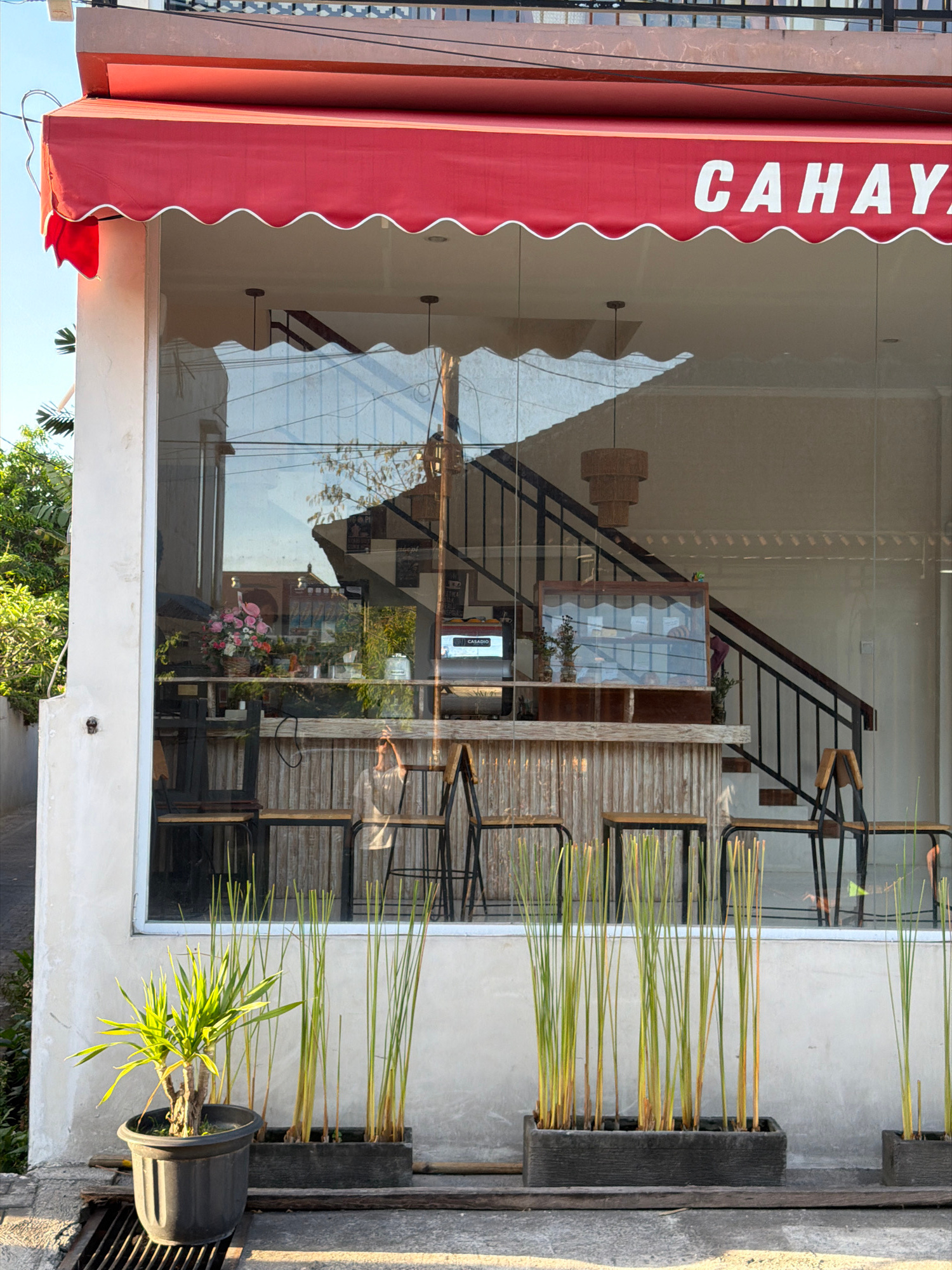 The image shows the exterior of a cafe in Denpasar, Indonesia. A red awning with the word "CAHAYA" in white covers the entrance. The large glass window reflects the surrounding environment. Inside theโฆread more