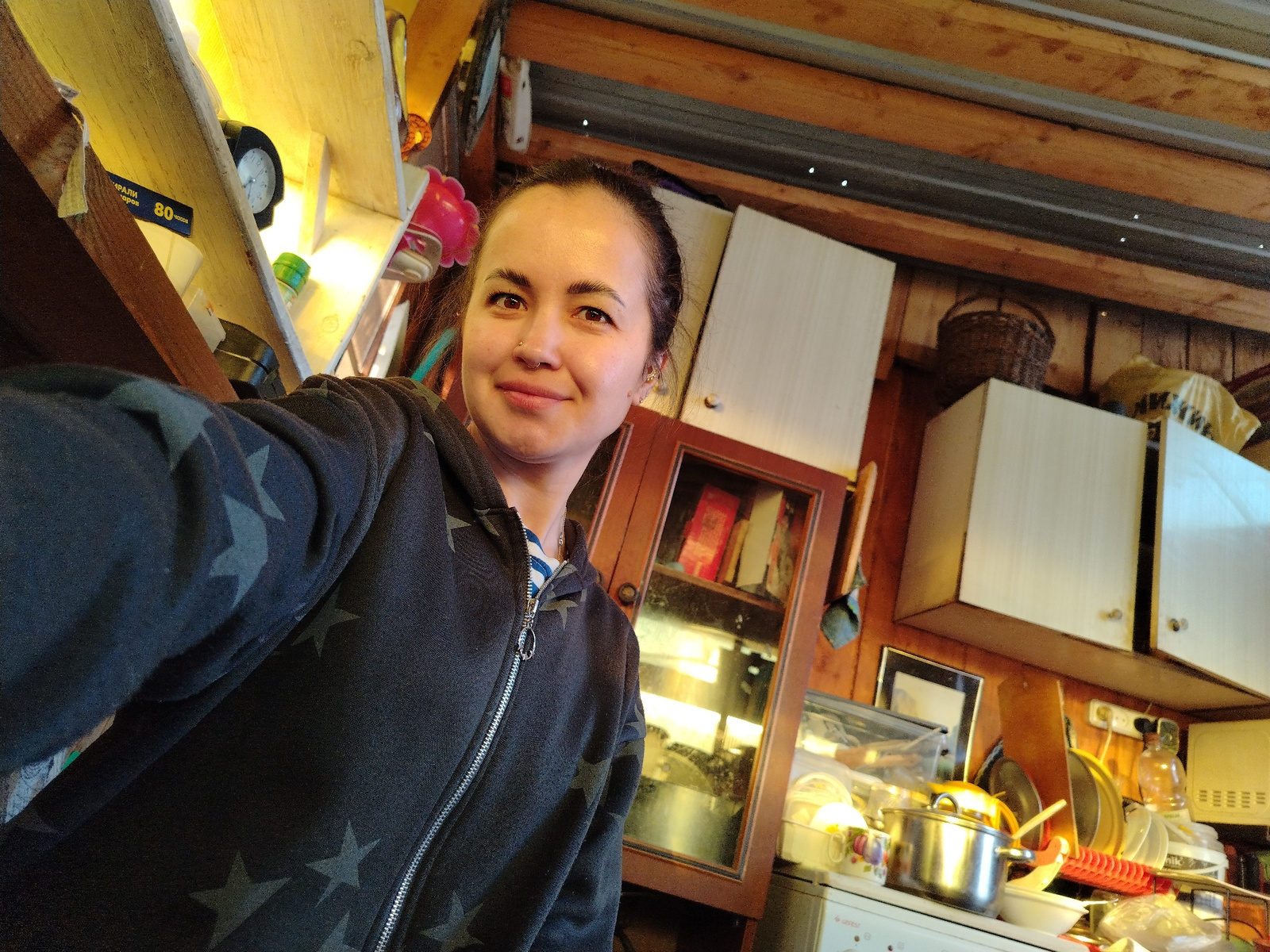 A selfie photograph shows a woman in an interior cluttered with household items. The woman is facing the camera with a slight smile. She has brown hair pulled back, and is wearing a black zip-up hoodi…read more