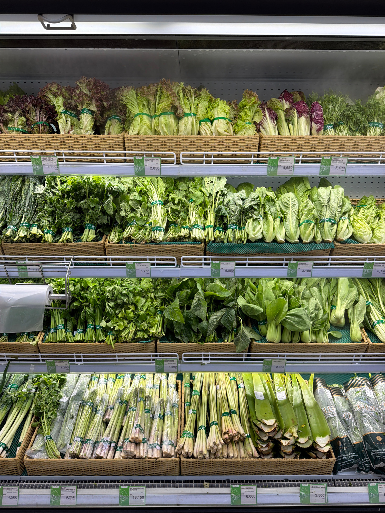 Here is a detailed description of the image: **Scene:** A display case in what appears to be a grocery store setting. **Location:** Judging by the Indonesian price tags (IDR) Kedewatan, Indonesia. **Objects:** * Various types of leafy green vegetables are arranged on shelves in baskets. Types include (as indicated by price tags): romaine lettuce, baby romaine lettuce, bok choy, kale, radish, butter lettuce, and curly leaf lettuce. Other items include aloe vera and asparagus. * Each type of vegetable is tied together in bundles with green string. * Price tags in Indonesian Rupiah (IDR) are attached next to each type of vegetable. * A roll of plastic bags hangs on a wire frame. **Environment:** * The interior lighting is bright. * The display is inside a refrigerated case with a visible glass door. * Vertical shelving units are visible. **Overall Impression:** The image depicts a well-stocked and organized produce section within a grocery store. The various leafy greens are fresh and neatly arranged to attract shoppers. | Open Wire