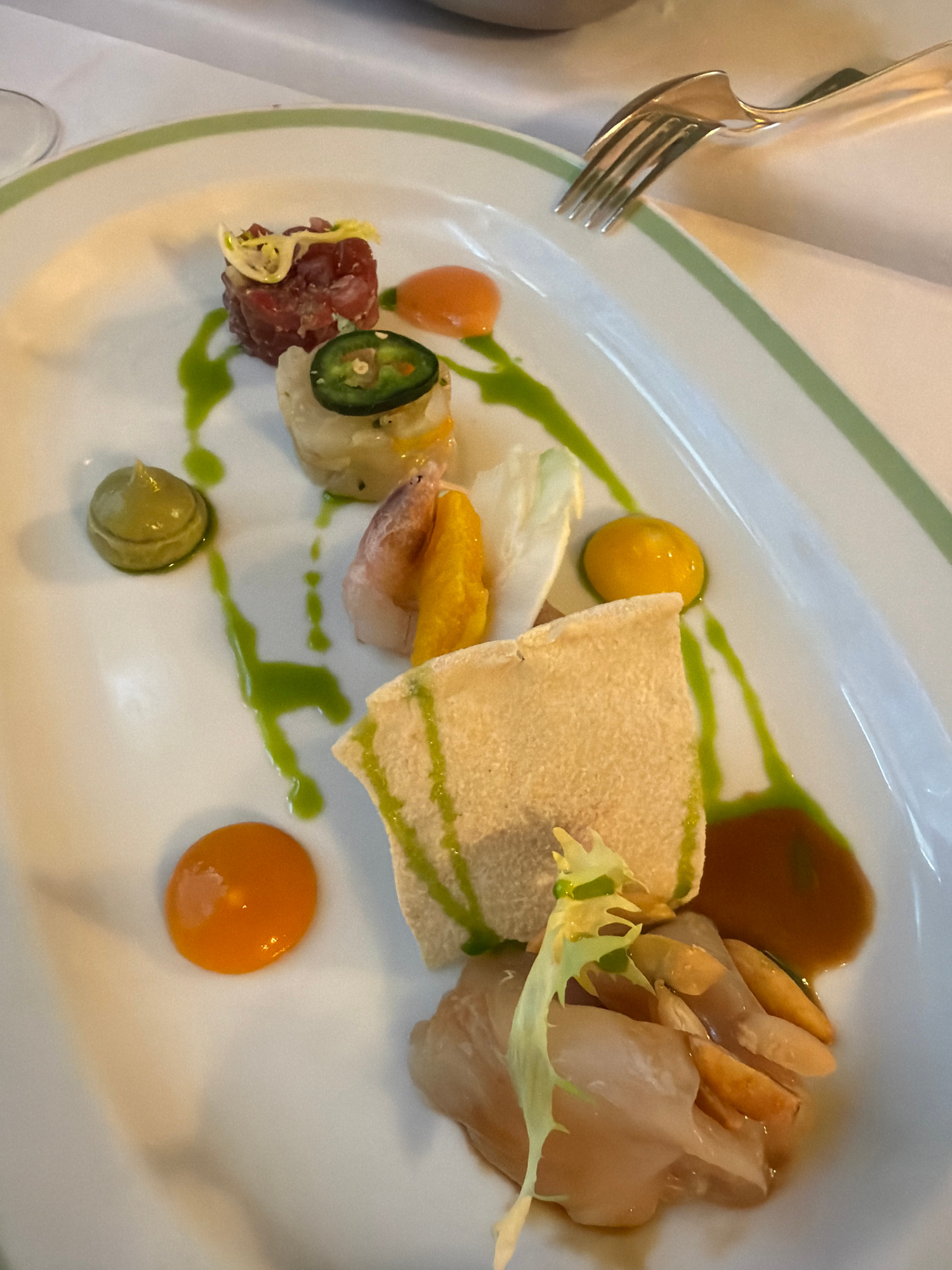 The image presents a meticulously arranged gourmet tasting platter on an oval white ceramic plate, detailed with a thin green stripe along its rim. The plate is positioned on a crisp white tablecloth.…read more