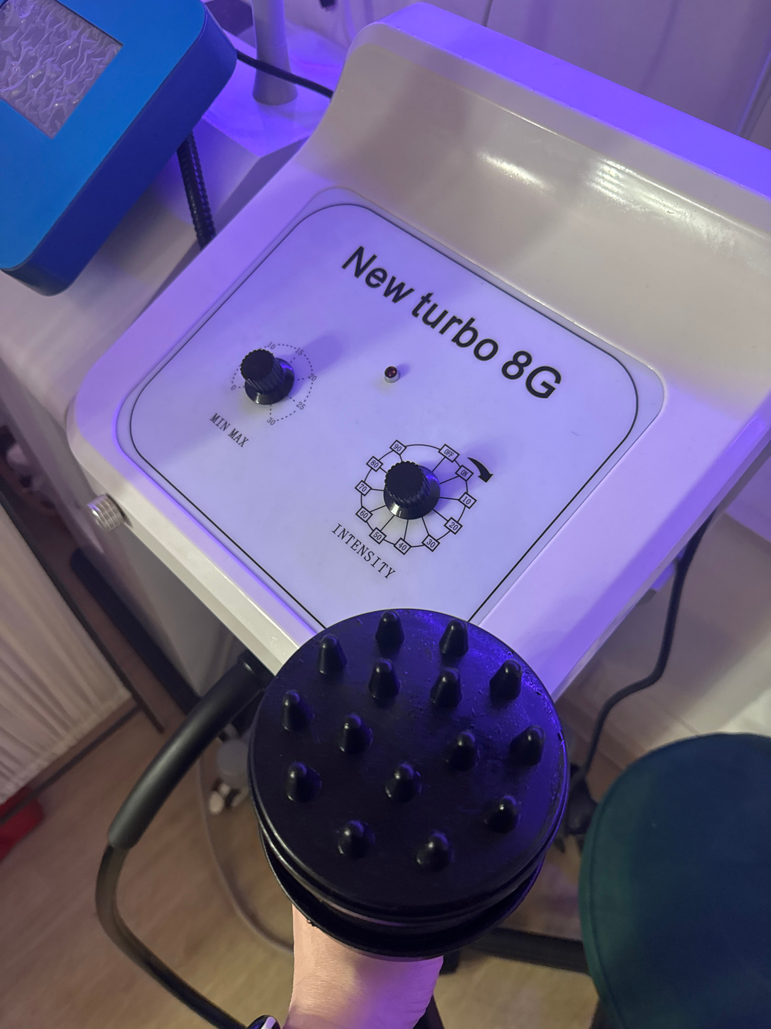 The image shows a white electronic device with "New turbo 8G" printed on the front panel. The device features two black control knobs and an intensity scale with numerical markings. A black handheld a…read more