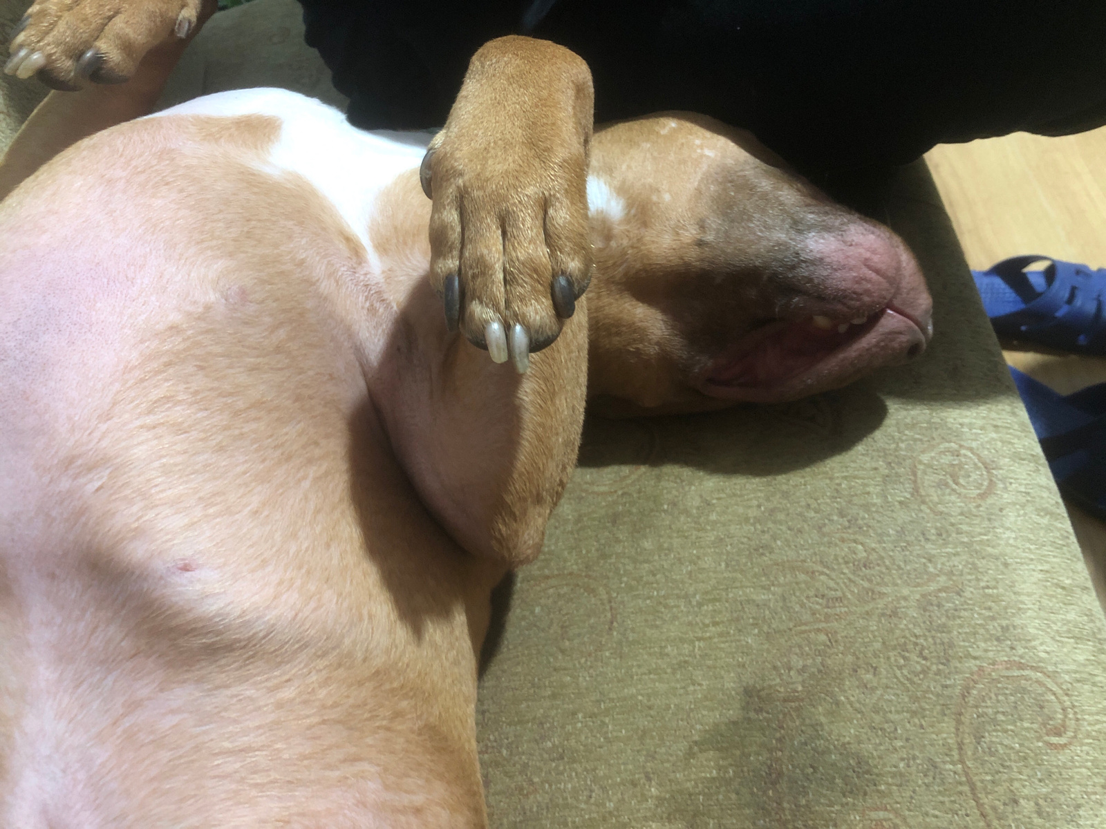 A tan and white dog is lying on its back on a green patterned surface. The dog's right front paw is raised and resting on its head. The dog's head is resting on the green surface. Its eyes are closed,…read more