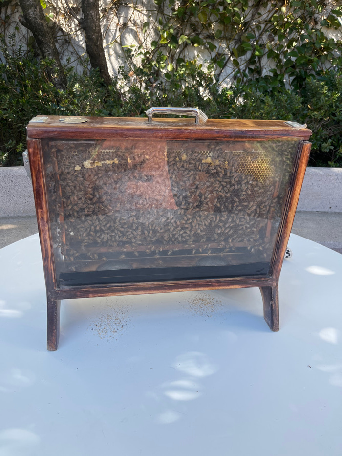 A glass-enclosed bee display case with a wooden frame sits on a white surface, angled slightly. Honeycombs and many bees are visible inside. A metal handle is affixed to the top edge. A portion of a t…read more
