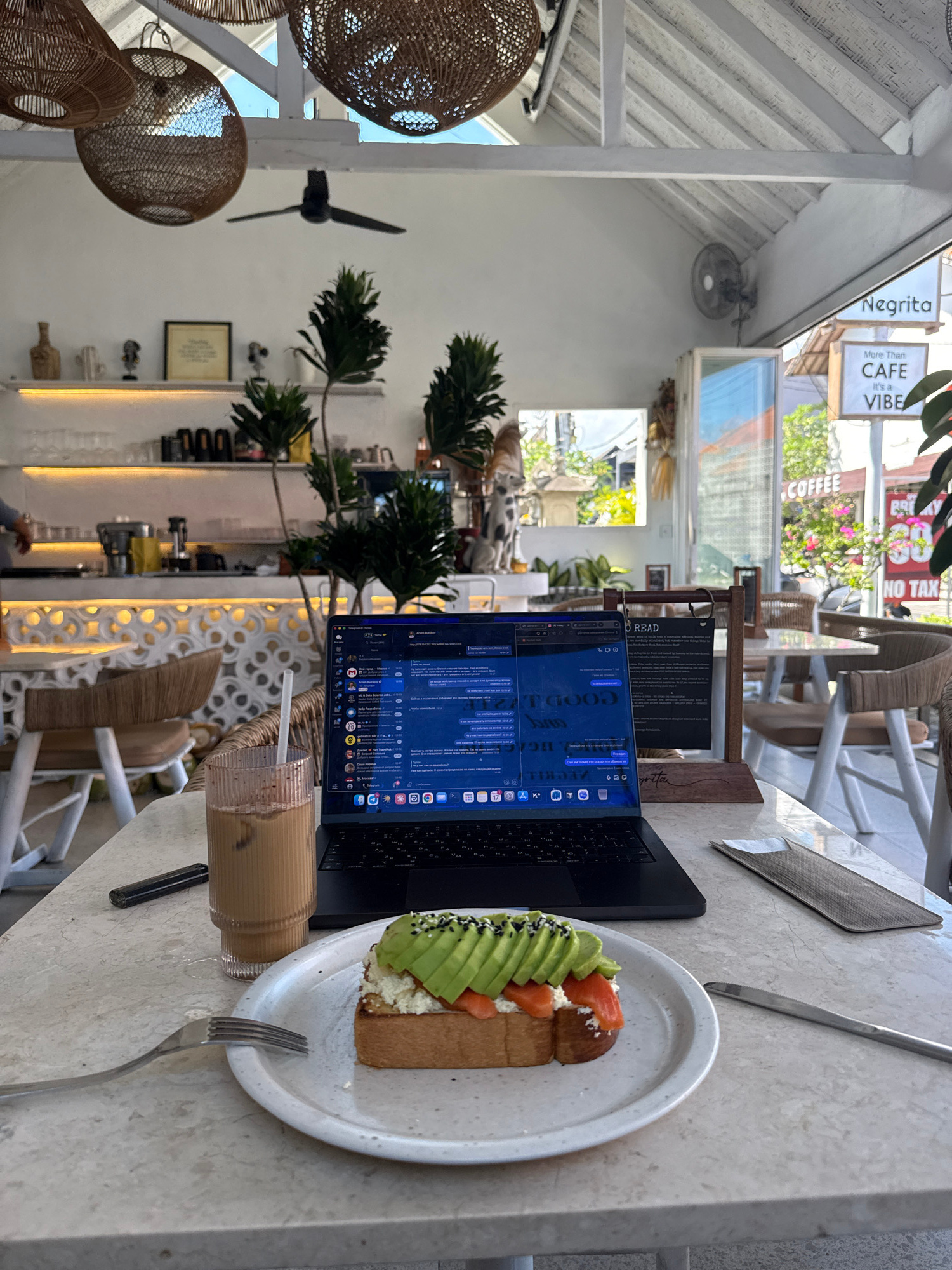 The image presents a bright, daytime scene inside a cafe located in North Kuta, Indonesia. The perspective is an overhead shot of a light-colored table where a black laptop is open, its screen display…read more