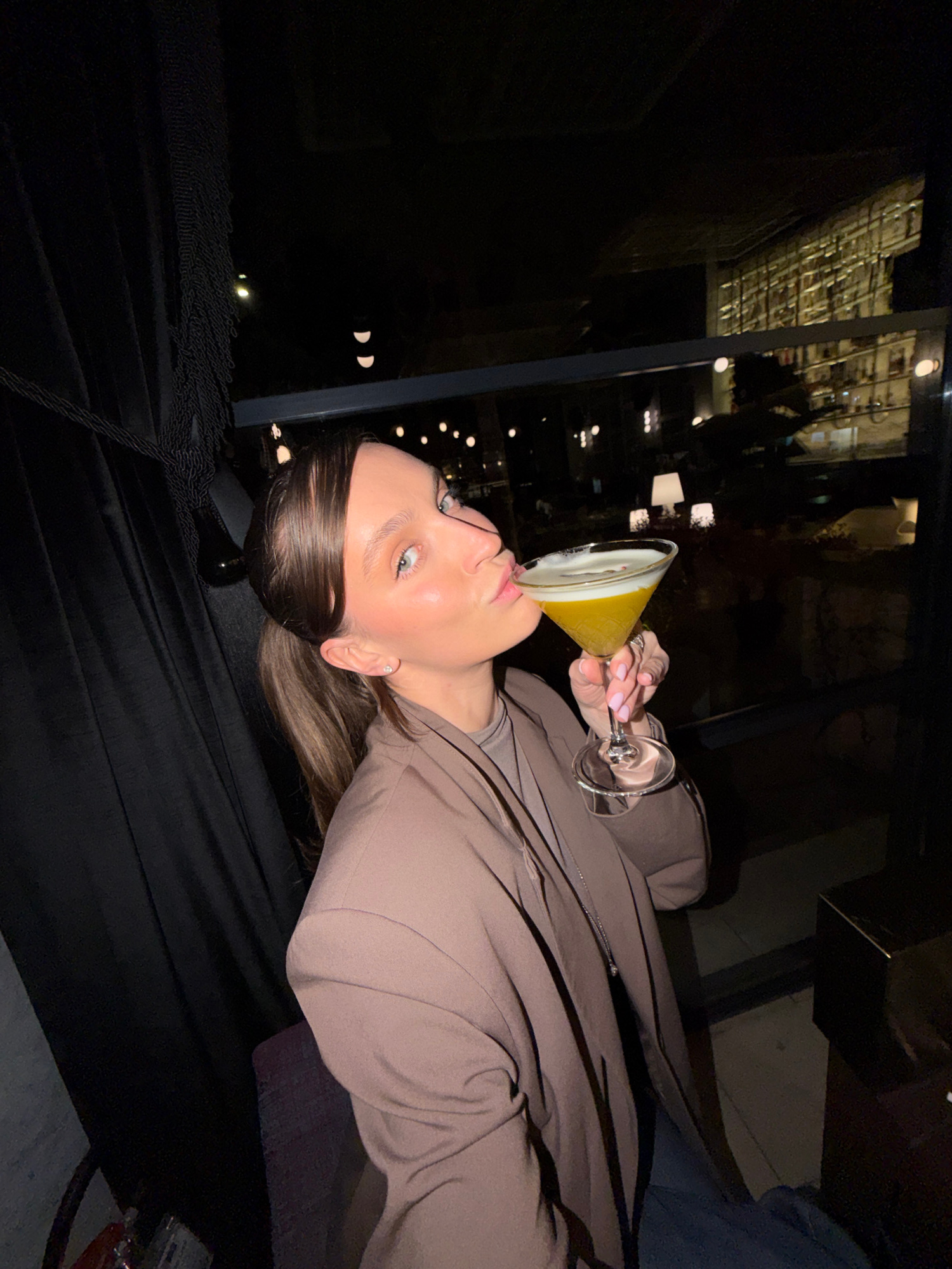 A woman is drinking from a stemmed cocktail glass with a yellow liquid, likely in a restaurant or bar in Budva, Montenegro. The woman has fair skin, light eyes, and light brown hair parted to the side…read more